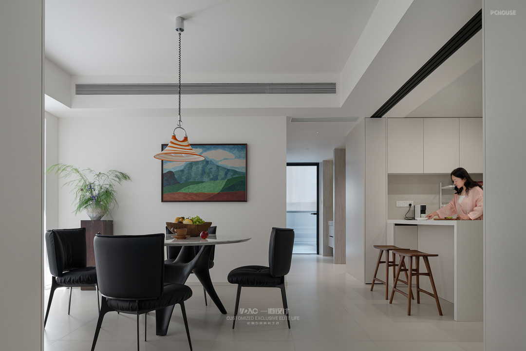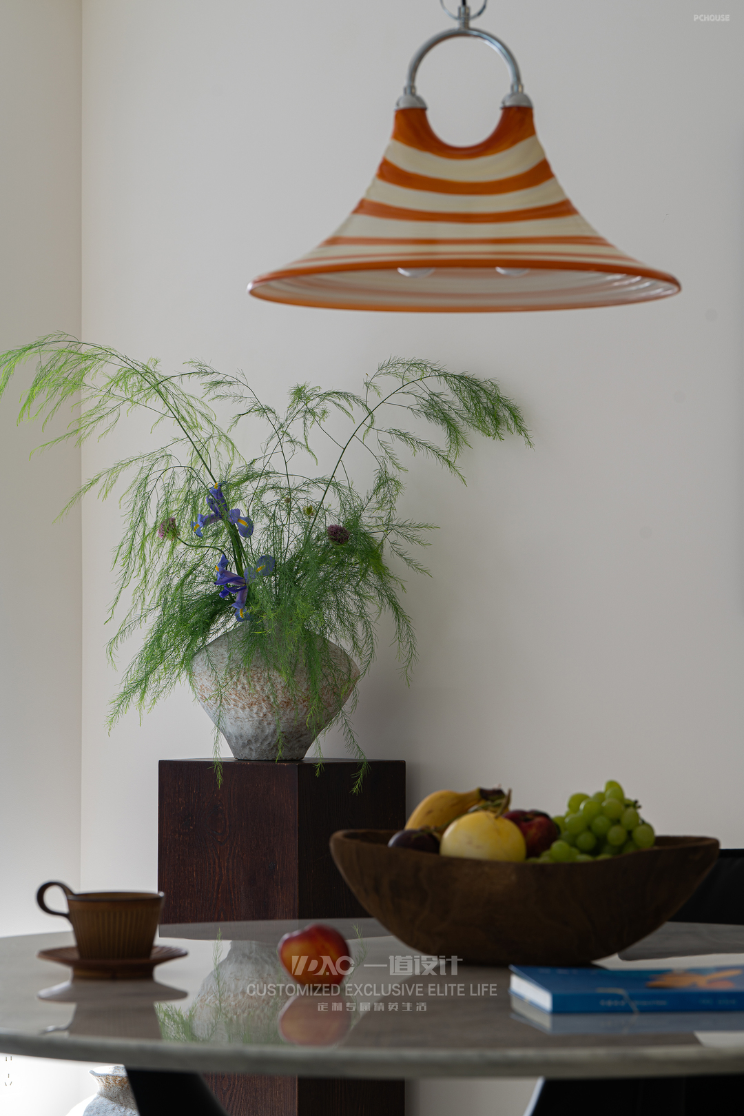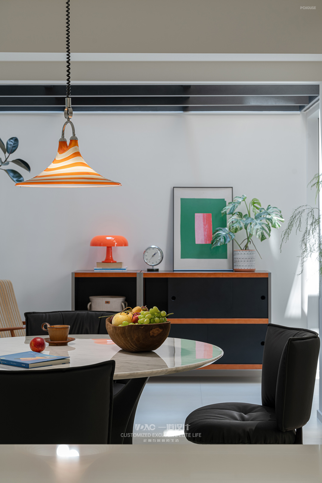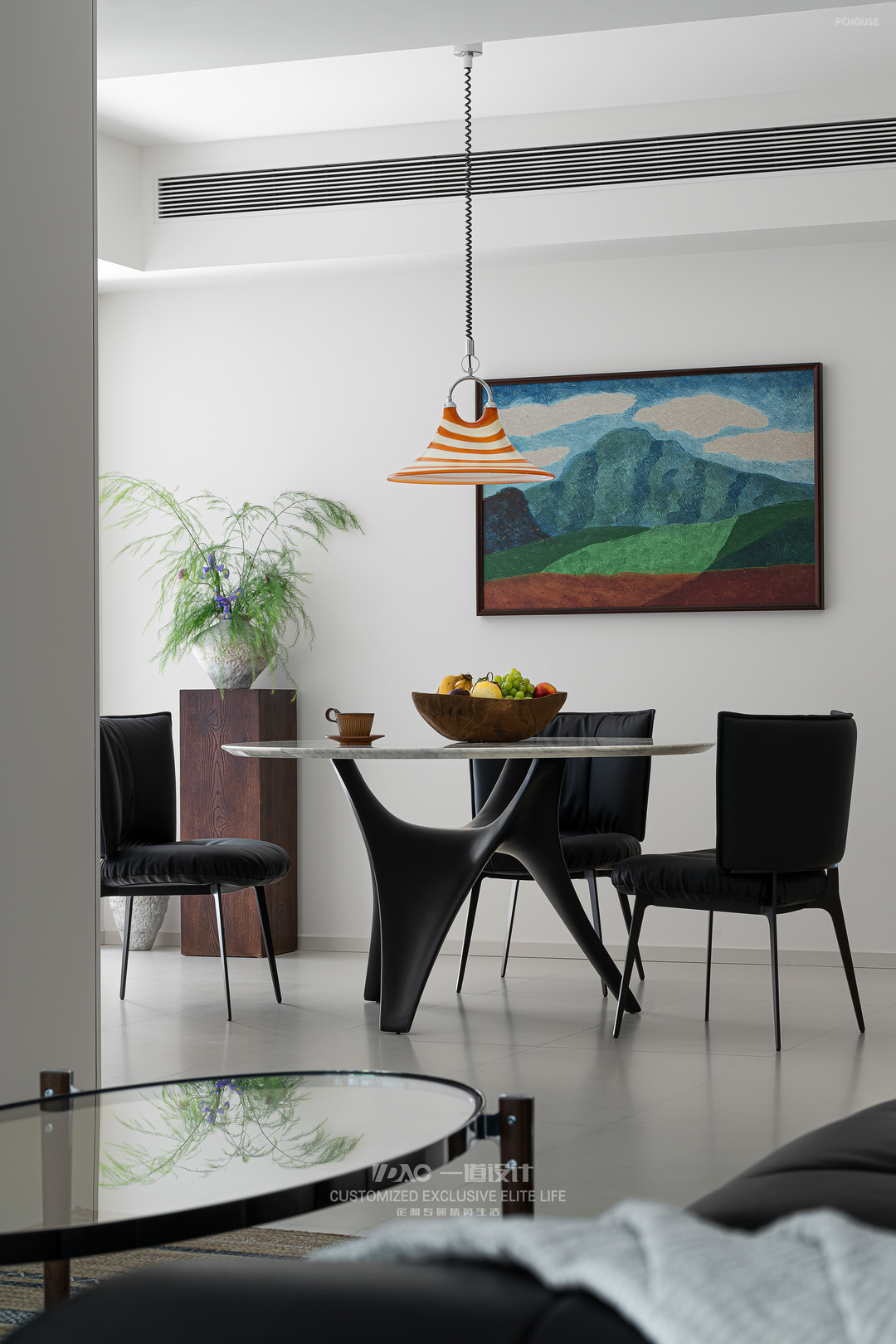 客餐厅为一体的设计,选用造型感更强的圆桌,白色岩板桌面,背后搭配中古感很强的挂画,与旁边木墩元素相呼应。