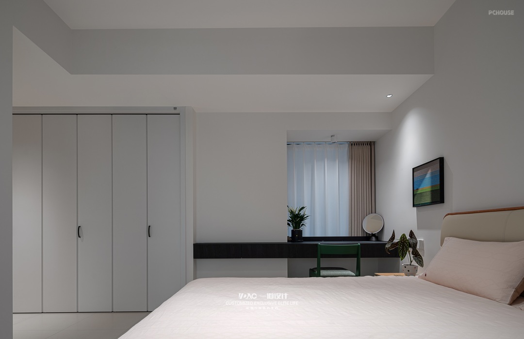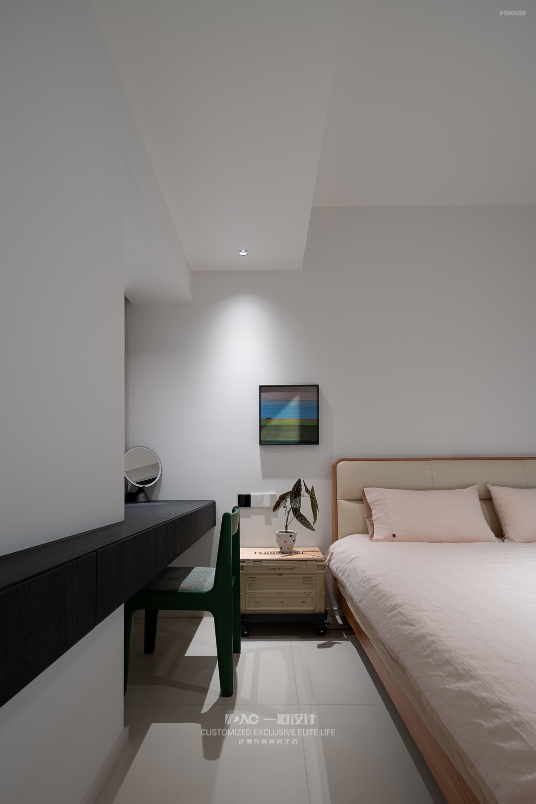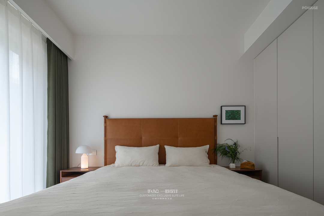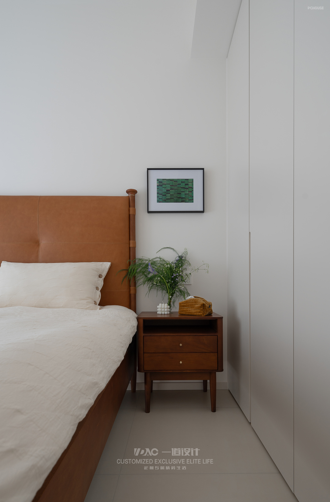 主卧地面延续公区肤感瓷砖,耐磨易打理,墙面以白色乳胶漆打底,缀以艺术挂画,简约中尽显高级质感。