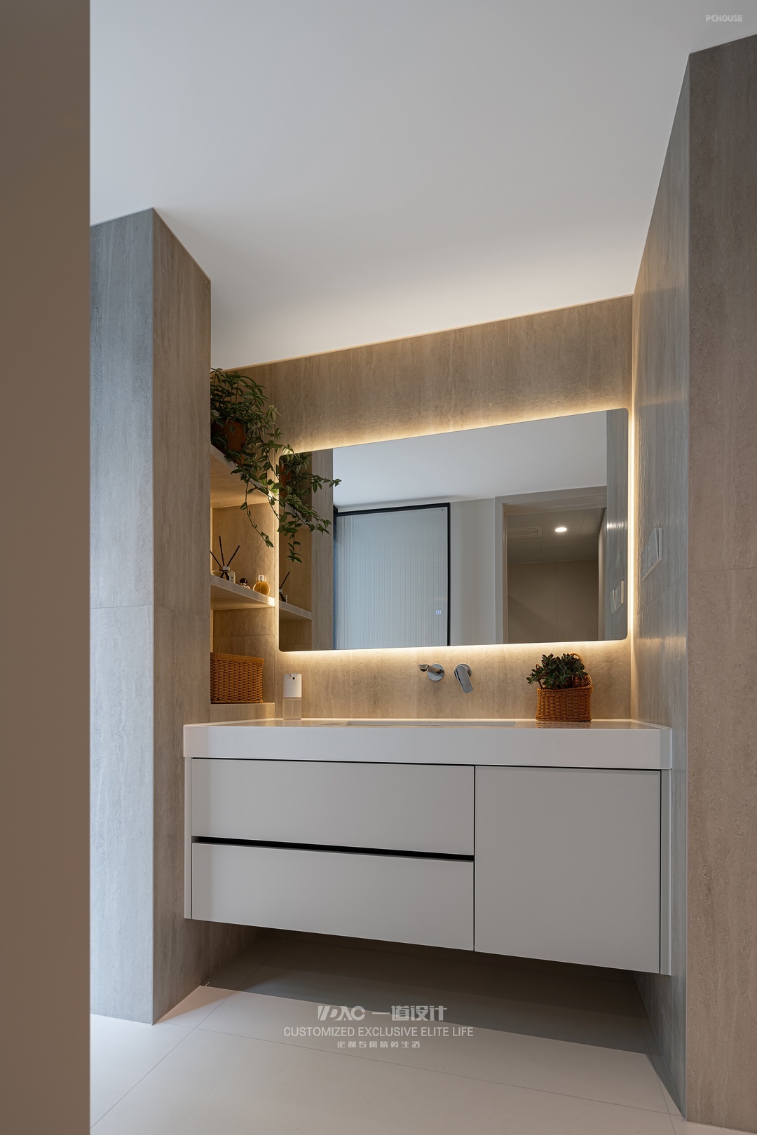 原本闭塞的一楼空间,通过空间重构,引光入内,实现入户迎面就是阳光和绿植,一下子就放松了下来。地面肤色柔光砖与墙面融为一体,有效提升空间的纵深感与开阔度。