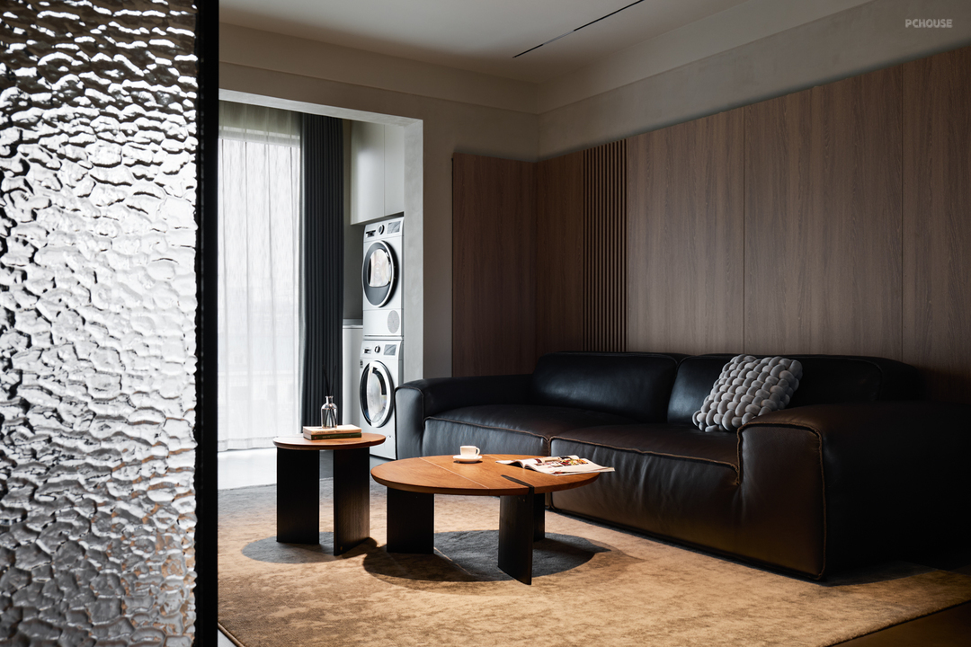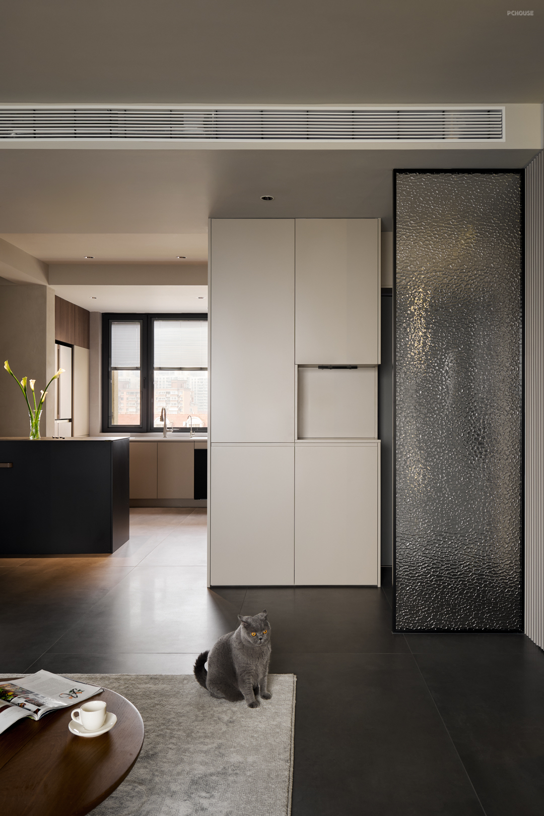 隐私与通透的平衡 为了保证隐私性,玄关柜对面采用了艺术磨砂玻璃隔断,一门到顶极窄边框,很有氛围感,采光通透,又具有隐私效果,避免了进门即见客厅的尴尬,使得整个空间既开放又私密。