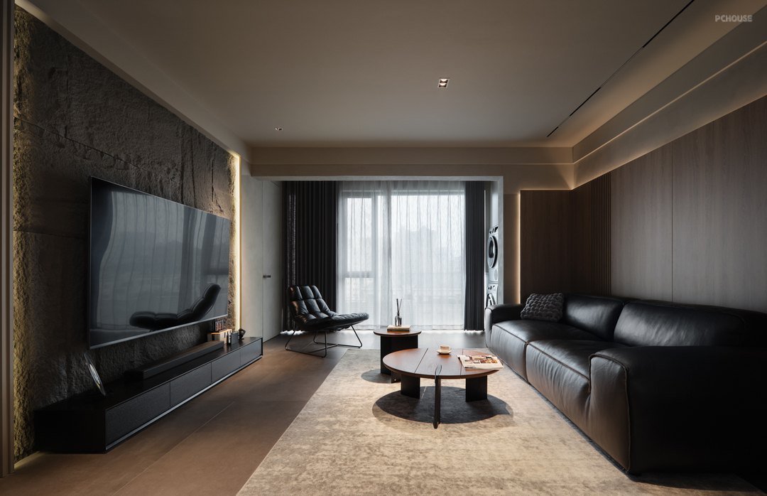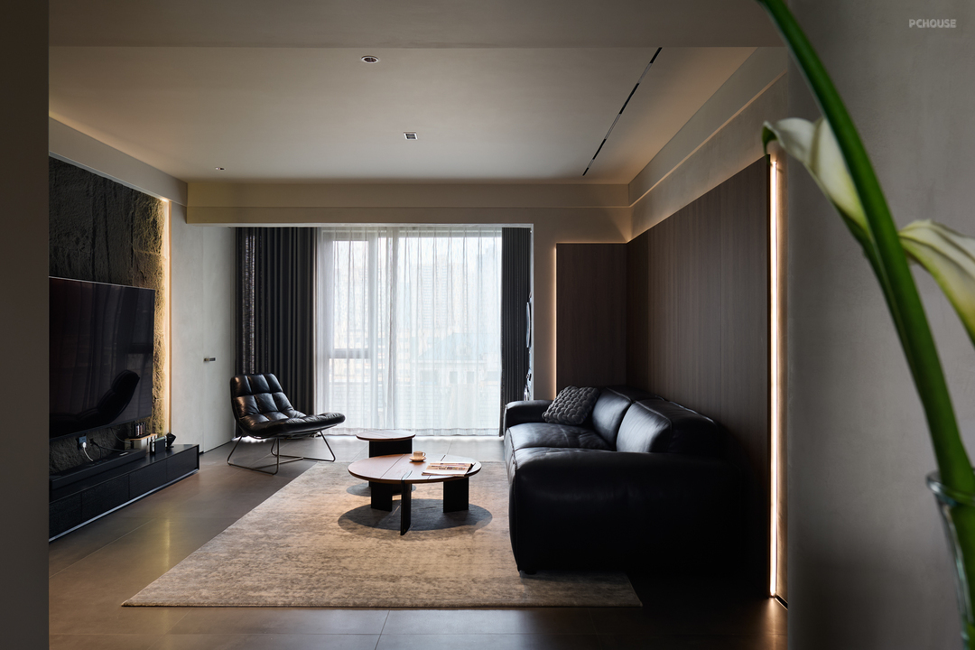在背景墙的周围,巧妙内嵌隐形灯带提供柔和的照明,增强墙面的立体感,使得整个空间更加富有层次和深度。沙发选择了一款舒适的黑色皮质三人座沙发,其简洁的线条和高级的材质也与背景墙的设计相得益彰,共同营造出一个既舒适又时尚的居住空间。