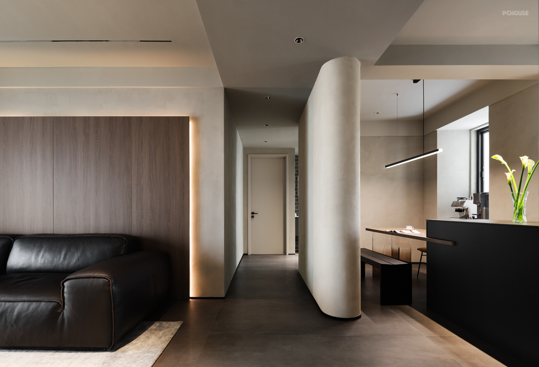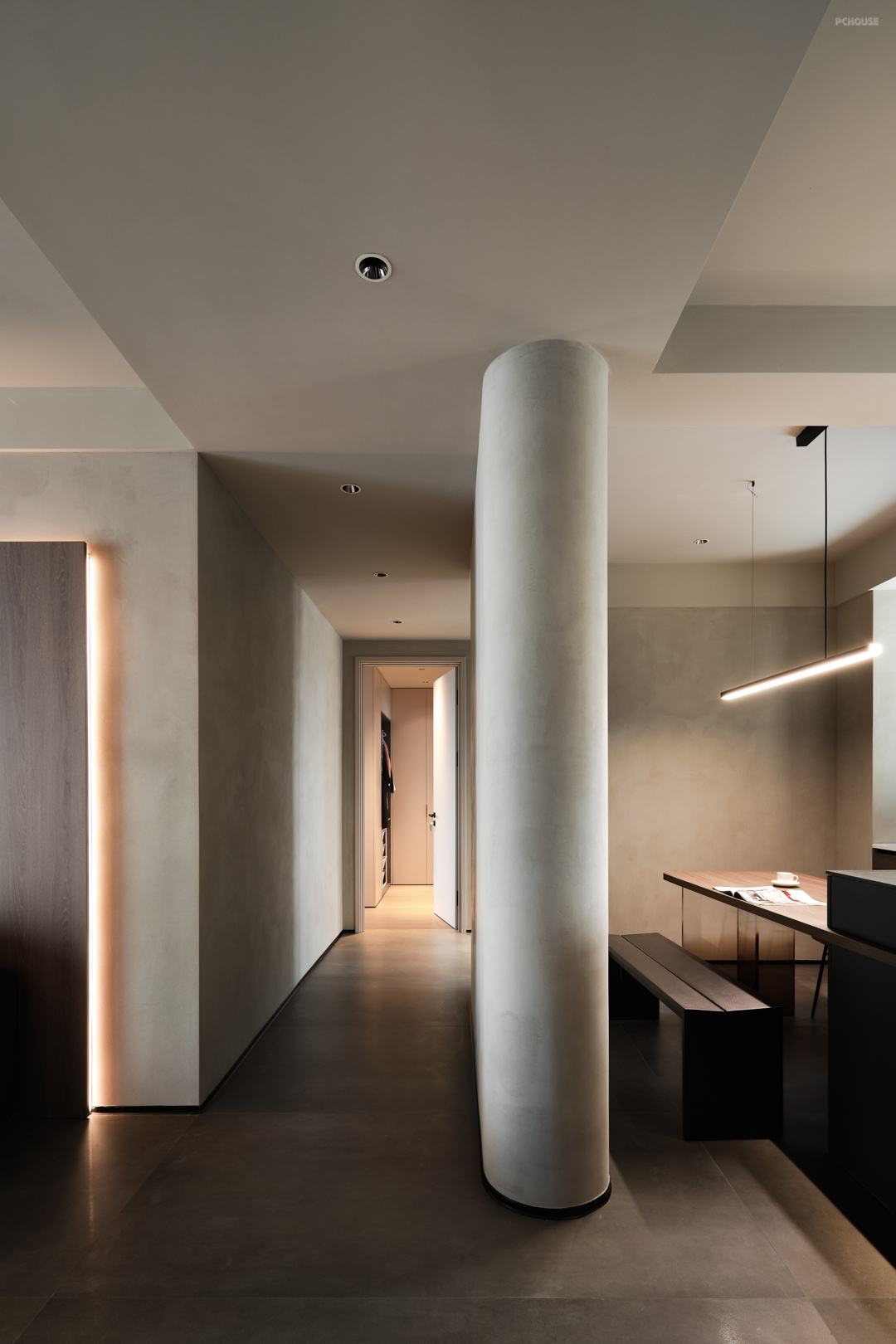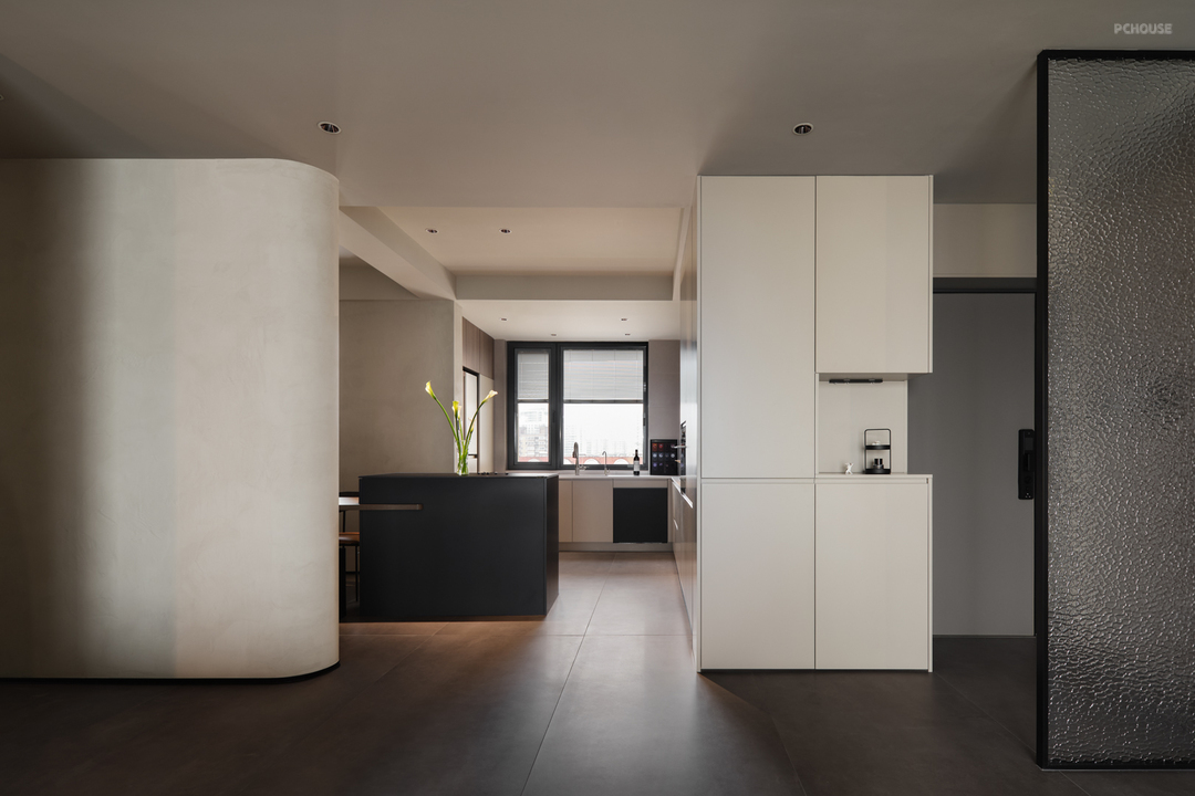 最引人注目的设计元素是那面弧形的造型墙。这面墙原本是承重墙,无法进行拆除。为了不破坏建筑结构的同时增加设计感,我们选择将这面墙整体包裹成弧形。这种设计不仅增强了空间的流动性和视觉美感,还为整体过道空间增添了一抹艺术气息。