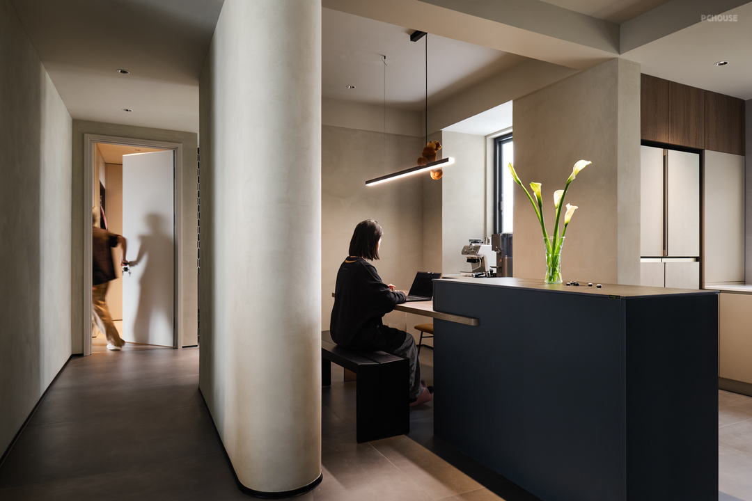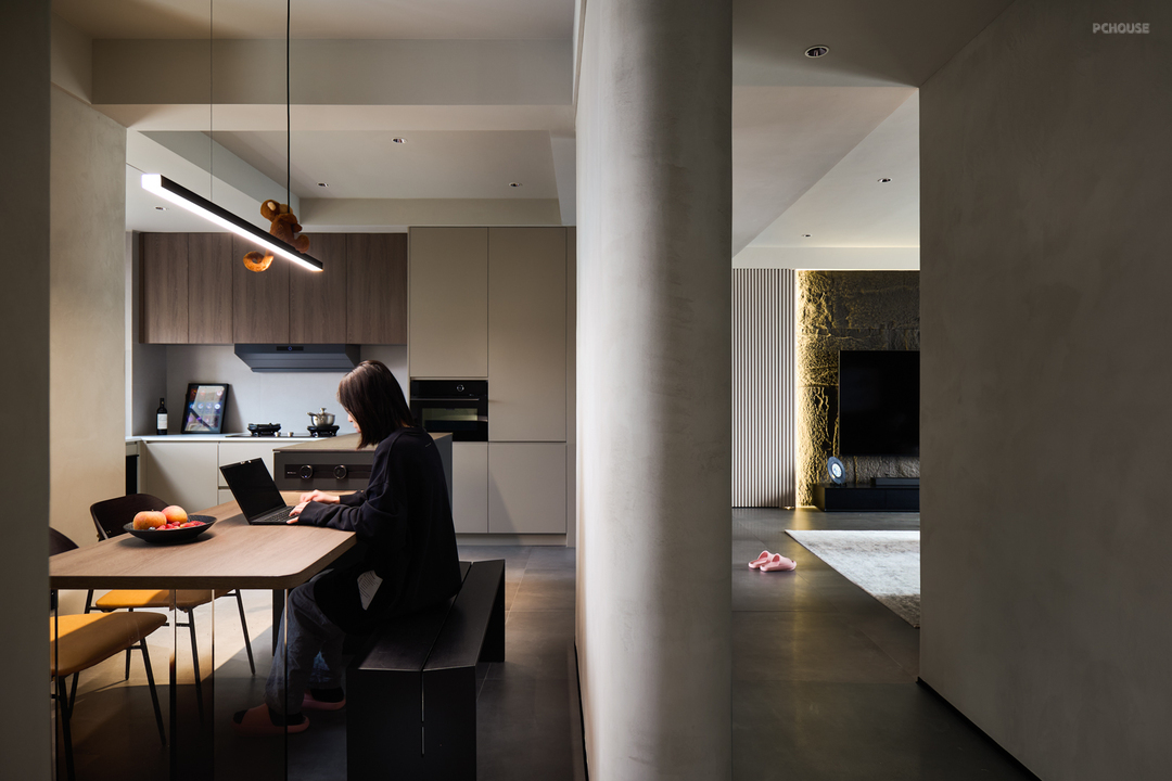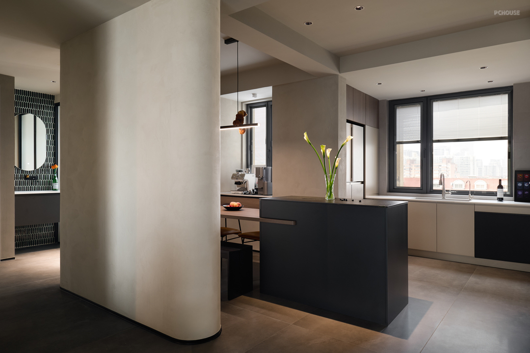 5、原始次卧打破设计开放餐厅空间,中间承重柱巧妙保留,与餐岛形成双洄型动线,既增加了厨房的功能性,也使得空间动线更加流畅;