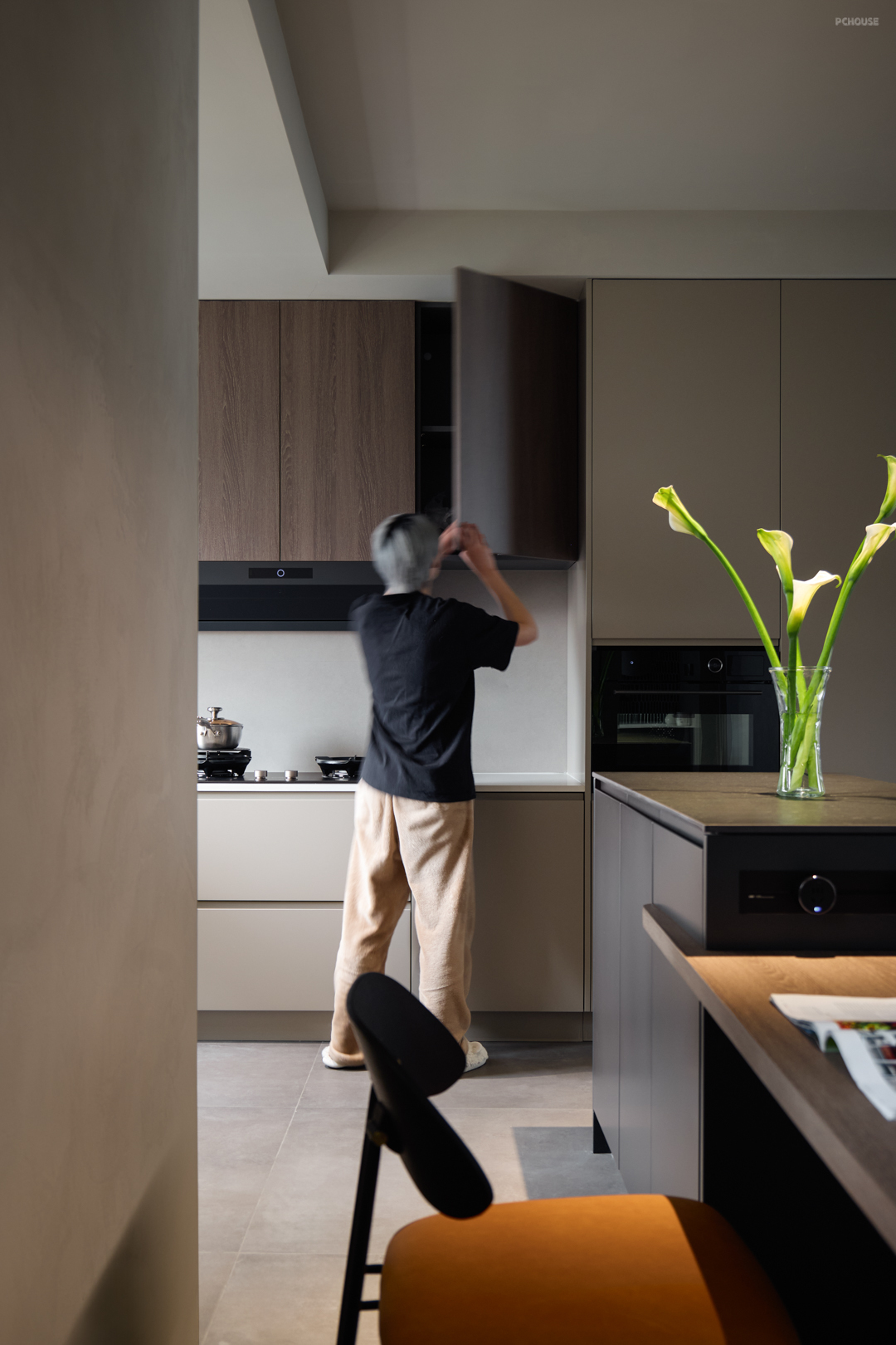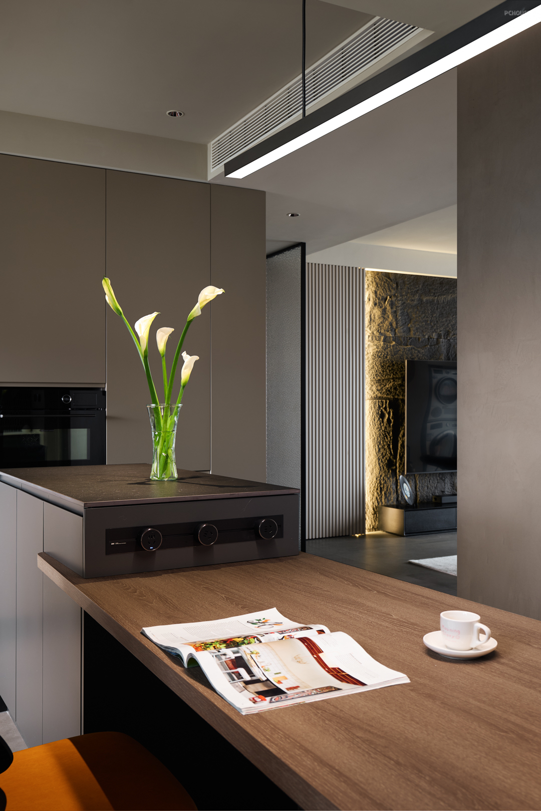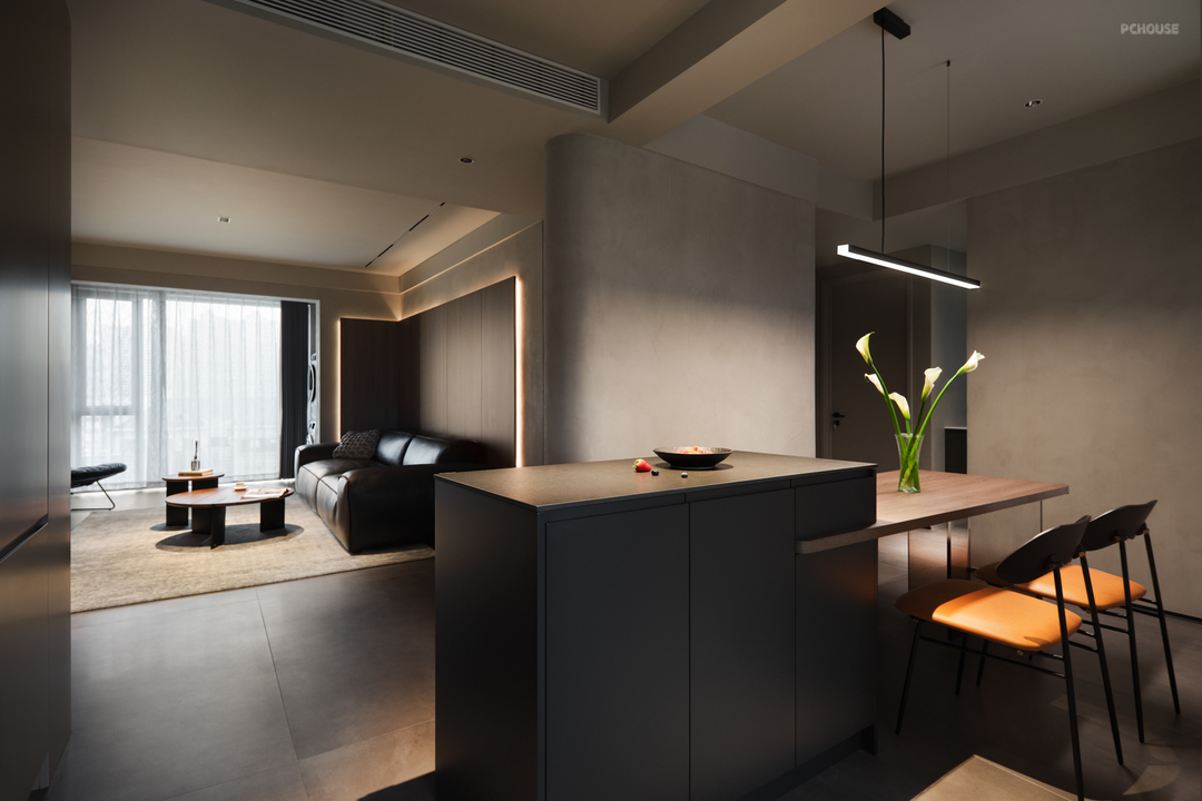 墙面采用艺术漆涂料,以其柔和而细腻的质感,为居室增添了一份温馨与雅致,营造出一种平滑而舒适的触感。餐岛一体设计巧妙地结合了功能性与美观性。餐桌穿插布置,既满足了日常用餐的需求,又增加了空间的层次感。黑色的岛台设计,不仅稳重,还与周围环境形成鲜明对比,提升了整体空间的视觉效果。在岛台下方设置储物柜,提升空间的利用率。