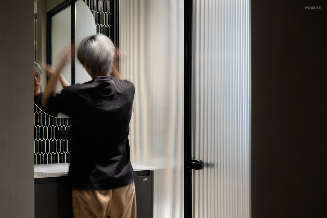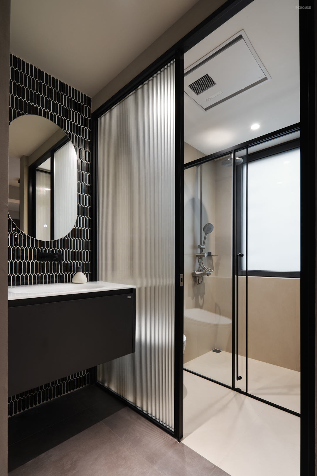 卫生间采用了长虹玻璃移门作为隔断,这种材质的透明度与质感,使得空间在保持私密性的同时,也保持了开放感。