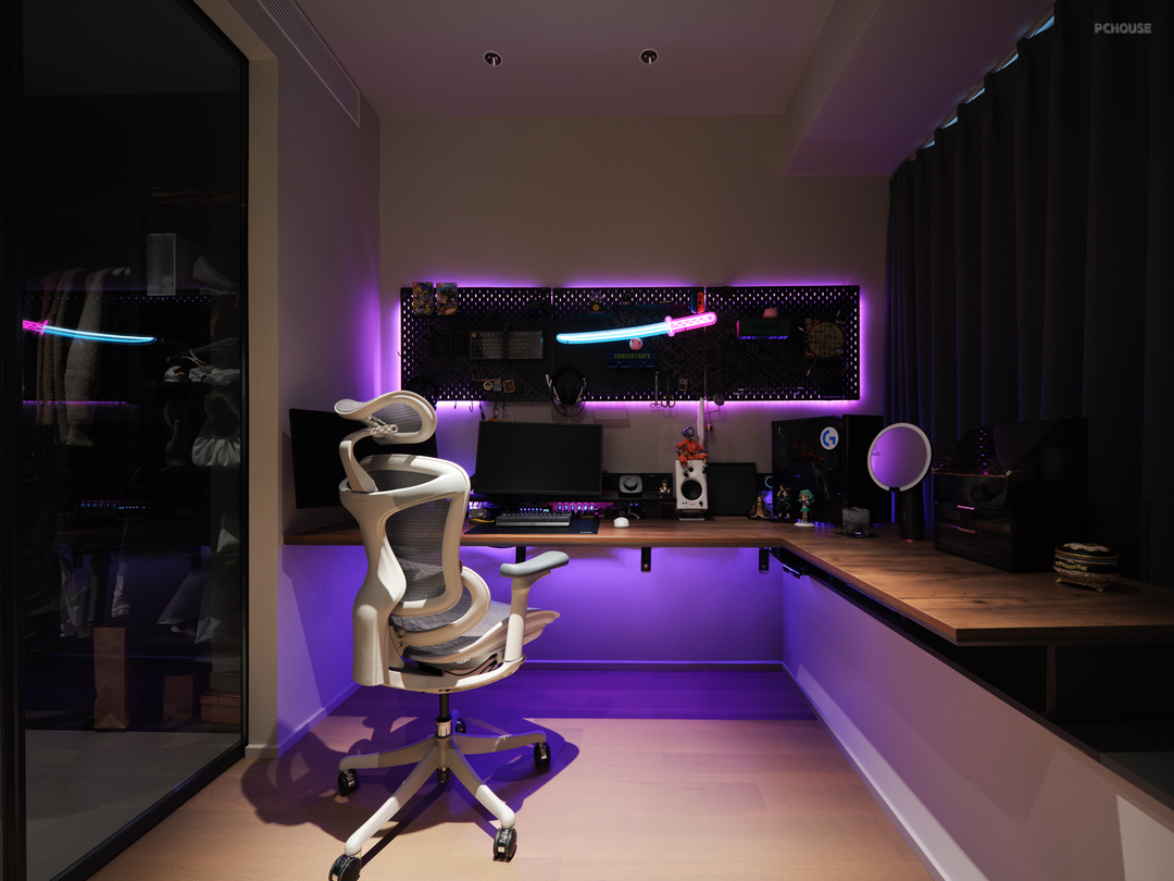 将原始次卧纳入主卧,设计成多功能房,游戏房+衣帽间。游戏房注重功能性与美观性的结合,旨在为游戏爱好者提供一个既舒适又充满个性的游戏空间,成为家居中的一处亮点。采用转角L形台面设计,结合紫色灯光打造一个既宽敞实用又时尚的游戏环境,增强空间的视觉吸引力。墙面挂载业主的各种装备,通过这些个性化挂件展示业主的独特品味。游戏室左侧设置移门,移门后隐藏着衣帽间,这种设计既节省空间,又保持了房间的整洁和私密性。