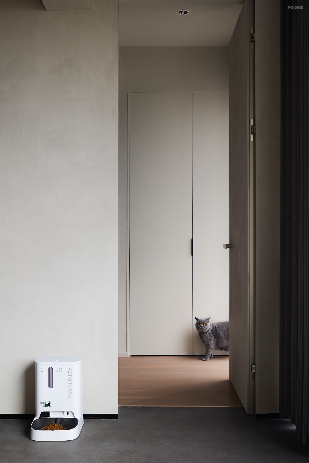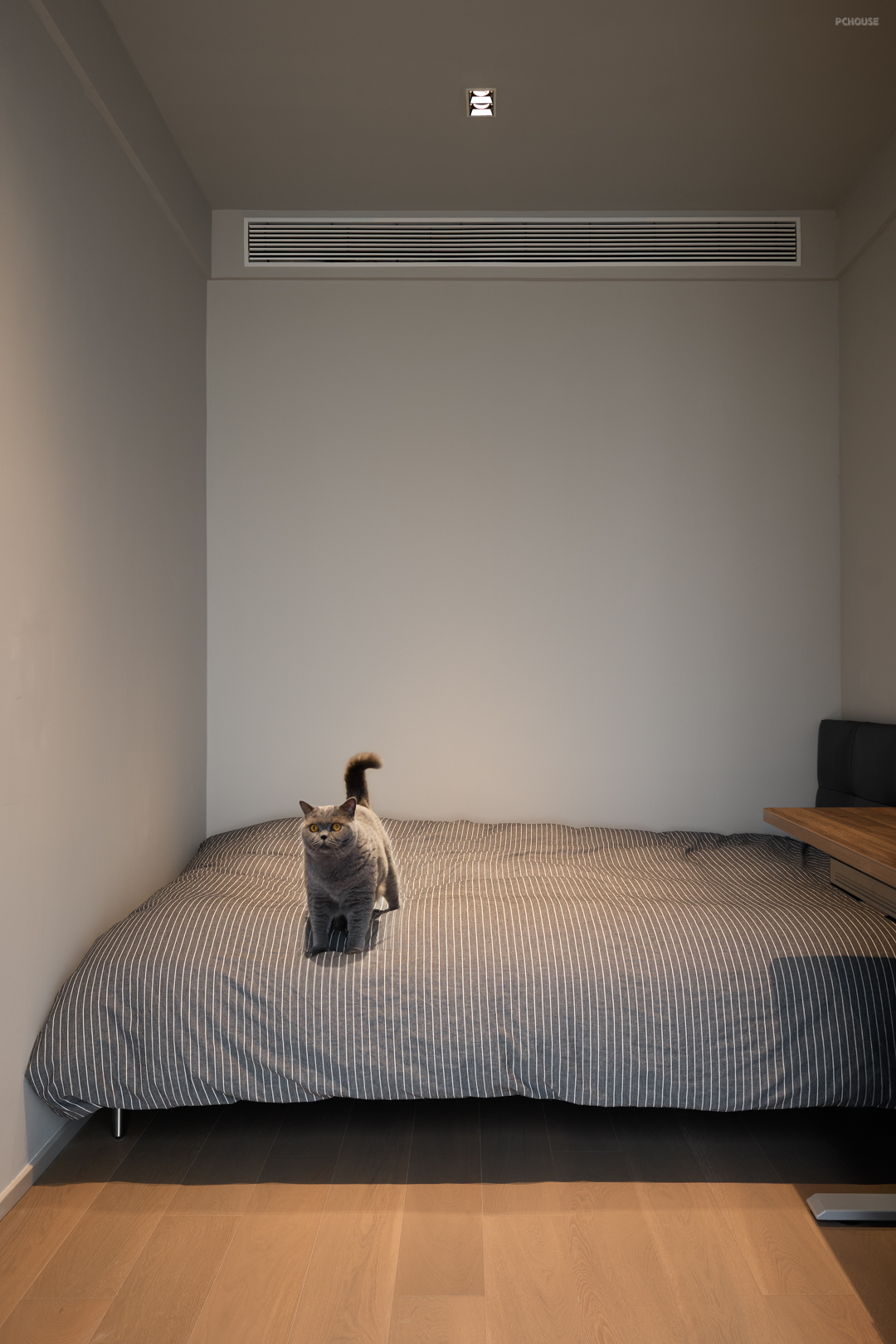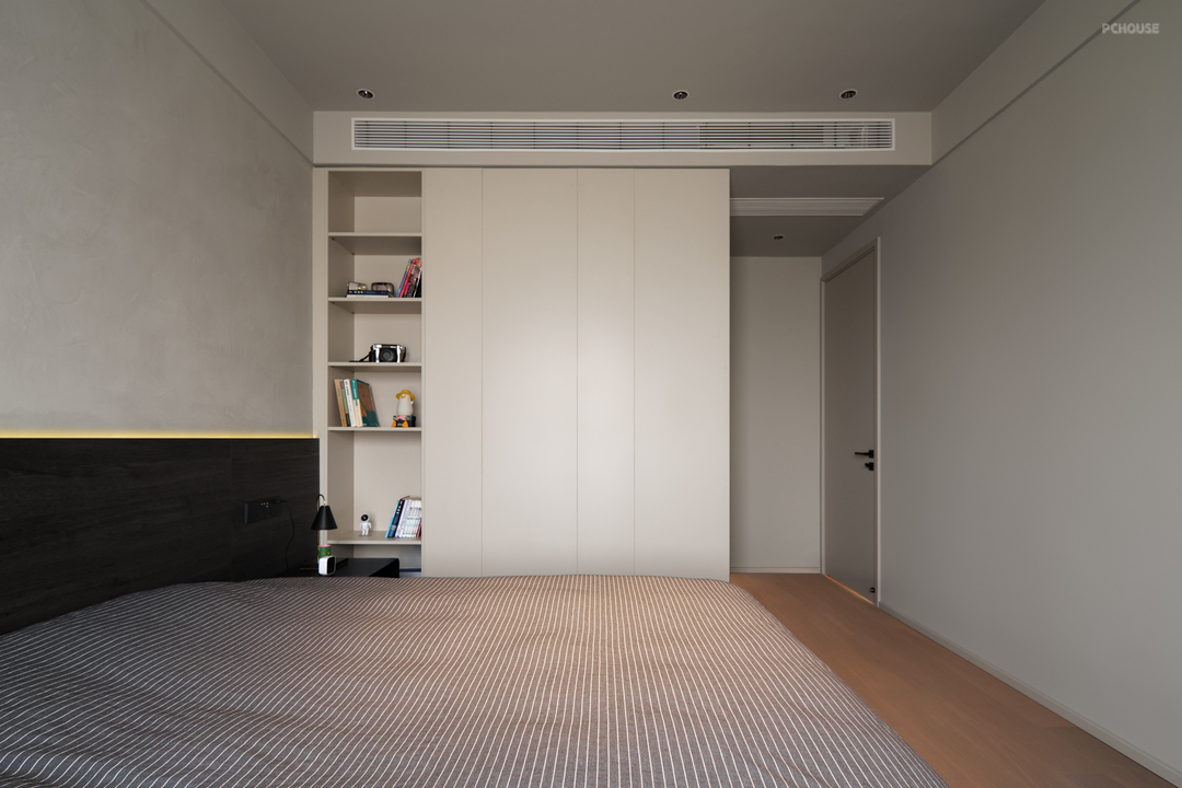 主卧与原始的次卧及卫生间结合设计成一大套间,打造房中房(游戏电竞室+双衣帽间+卫生间),提升居住幸福感,增添生活的便捷性。主卧休憩区靠墙一侧,定制的到顶衣柜与开放层夹板结合,形成了一个独特的展示空间。书籍和精美摆件放置于此,不仅便于拿取,也增添了空间的文化氛围和艺术气息。衣柜的柜门设计无门把手,这种极简的风格不仅美观大气,也使得整体空间更加整洁。