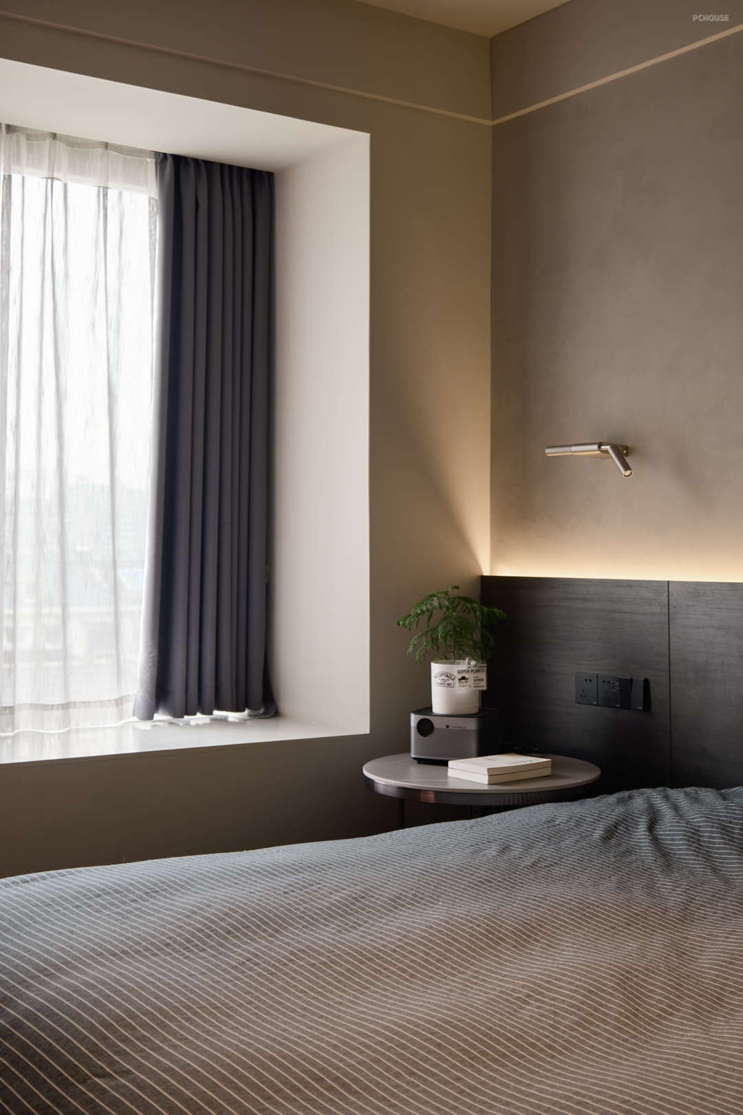 床头背景墙采用艺术漆与木饰面拼接,隐藏嵌入式灯带设计,创造出丰富的视觉层次,增添氛围感。在床头一侧,选择一款个性的极简壁灯,不仅为卧室增添了一抹现代感,还巧妙地提升了灯光的层次感。搭配一个圆形小边柜,其圆润的线条与壁灯的简洁设计相得益彰。边柜上可以摆放一些常读的书籍和一个投影仪,方便在床尾的墙面上投射影像,享受私人的影院体验。