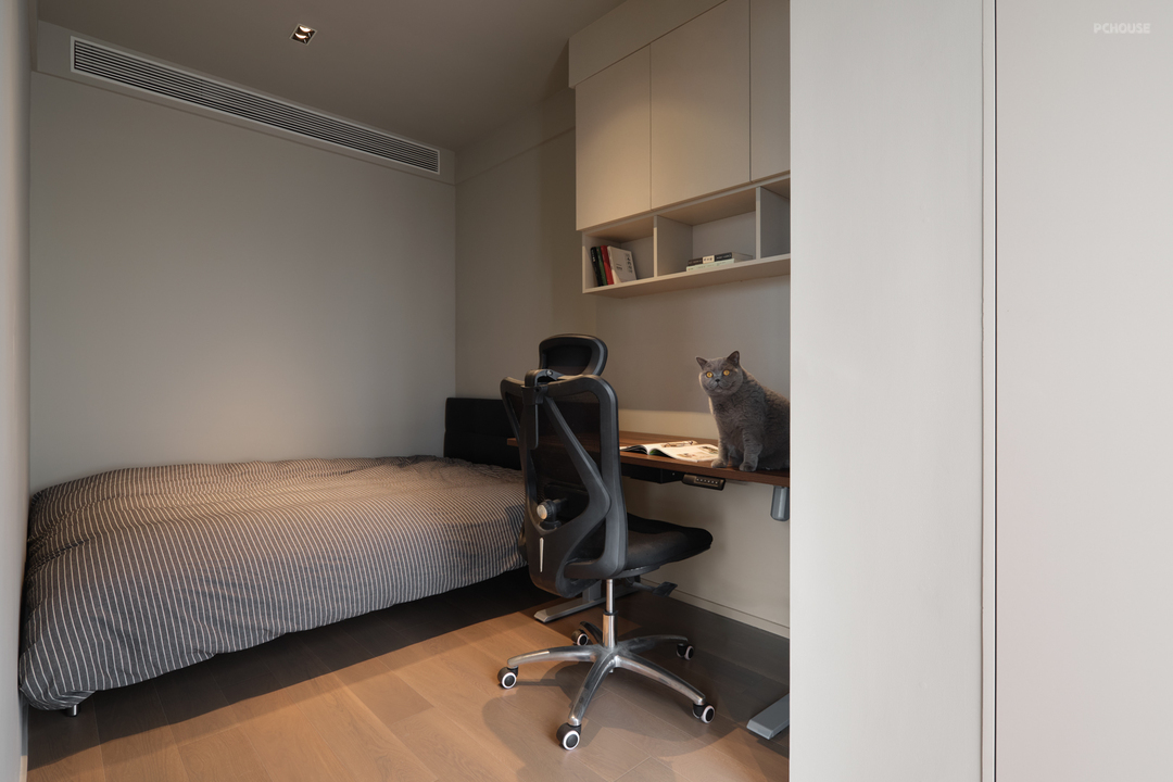 次卧改造:书房与临时客房的完美结合 其中一女业主从事产品工作,需要一个既能激发创意又能保持专注的办公空间。因此我们将原始的次卧与部分阳台空间结合,改造成书房与临时客房,不仅增加了功能性,还充分利用了阳台空间,实现了储物与休闲的双重功能。书桌选择了上下可调动的升降桌,如果坐着办公累了,可以站起来办公,更灵活自由。