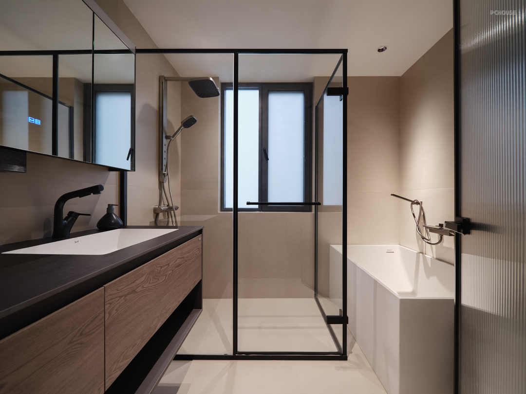 主卧卫生间台盆超大黑色台面,使用更舒适。上方安装镜柜,不仅增加充足的储物空间,通过镜面的反射还增加空间的视觉深度。镜柜内部的分隔合理,便于分类收纳各种洗漱用品,保持台面的整洁。台盆柜采用悬空设计,不仅美观,还便于清洁。淋浴房与浴缸的结合满足不同的洗浴需求。无论是快速淋浴还是悠闲泡澡,都能得到满足。墙地采用同色系材料,增强了空间的统一极简效果,使得卫生间整体更有格调。