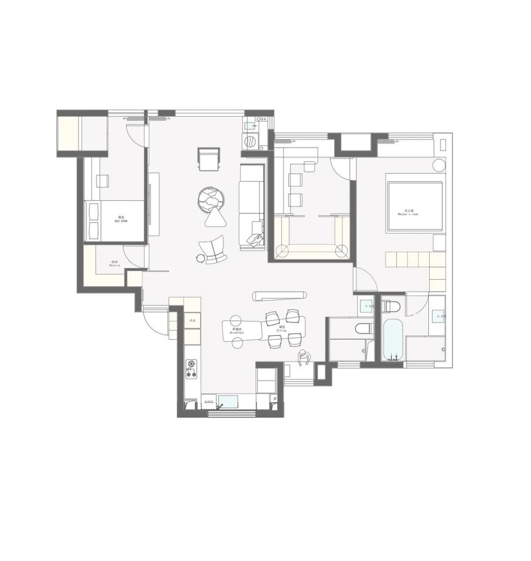 改造后打造宽敞舒适的客厅空间,满足社交的开放式餐厨一体。超大的主卧大套房配置房中房(游戏电竞室+双衣帽间+卫生间),提升居住幸福感。书房也是多功能房办公+休憩临时客房使用。主卫容纳常规功能外,设计浴缸泡澡放松身心。