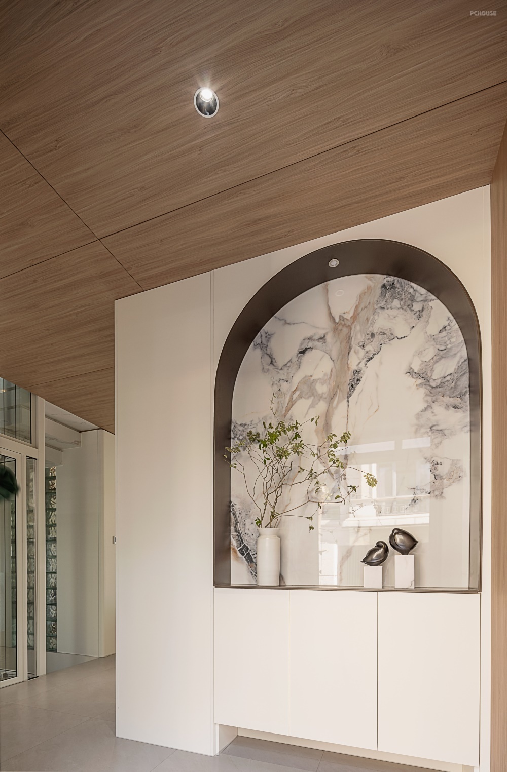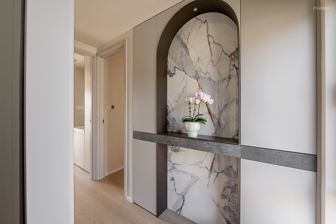 进门正对的鞋柜端景采用拱形内嵌潘多拉岩板点缀,成为视觉焦点,底部悬空预留常换鞋位,搭配暗藏灯带提升通透感。