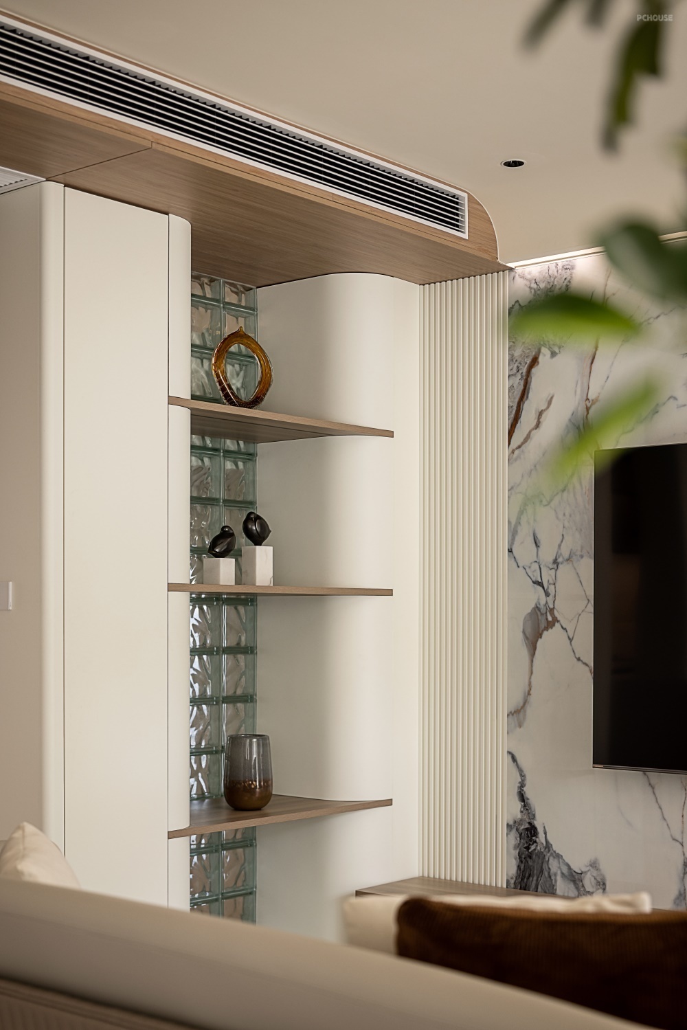左侧弧形墙面+木格栅,结合柜体,嵌入层板架+玻璃砖的组合,既引入自然光影,又巧妙的与楼梯间进行区域划分