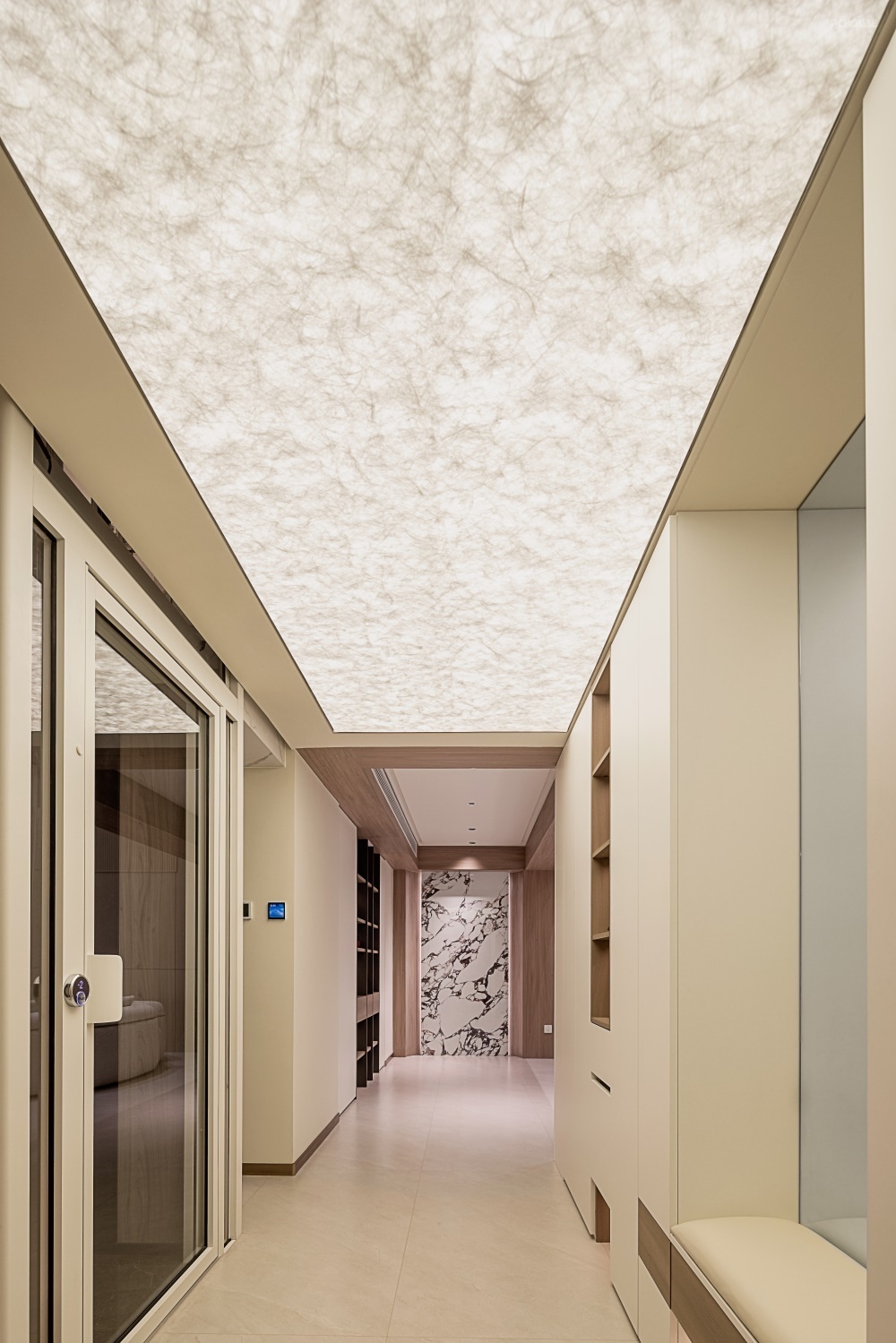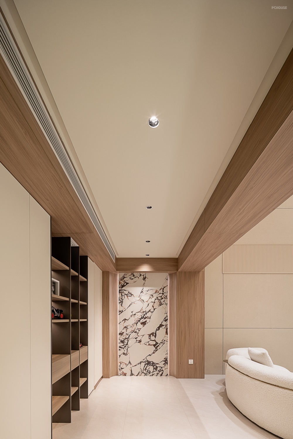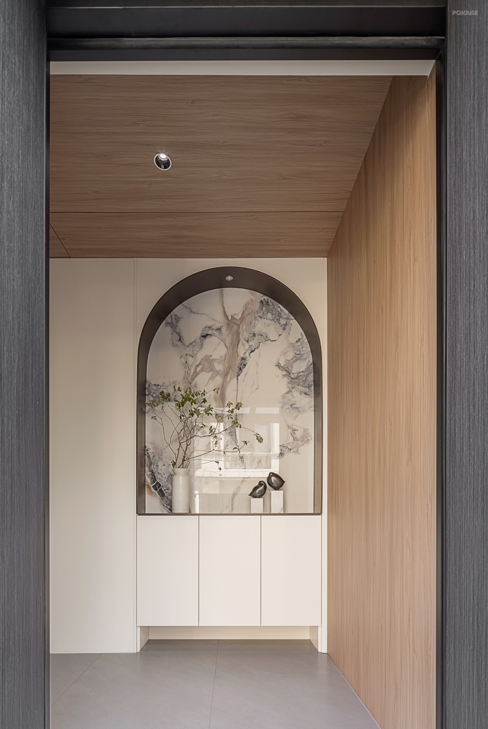 墙面侧面及顶部以木饰面铺陈,温润木纹与白色柜体形成冷暖对比,底部延续全屋地砖通铺,通过材质过渡自然衔接室内外,让归家第一视角既具仪式感又不失温馨。