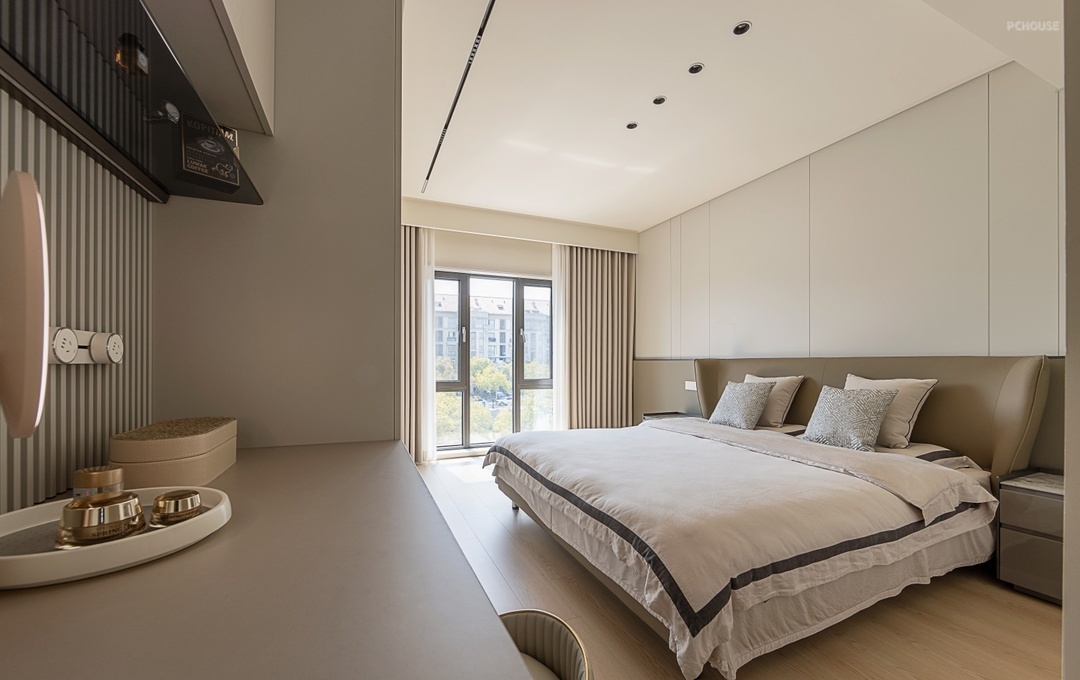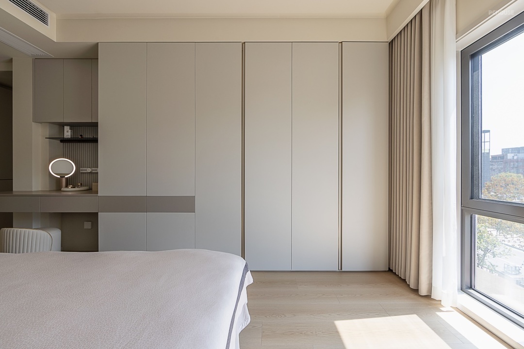 床尾区域将衣柜与化妆台进行一体化定制,顶天立地的衣柜收纳很强大。