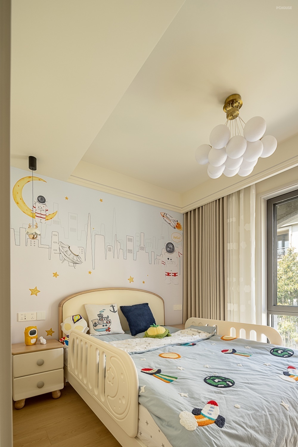二楼的男孩房以科技感与安全性为设计核心,打造兼具趣味与实用的成长空间。床头背景墙整体铺贴科幻主题壁纸,城市建筑线条与宇宙星轨图案交织,仿佛将浩瀚星河引入室内,为空间注入未来感氛围。