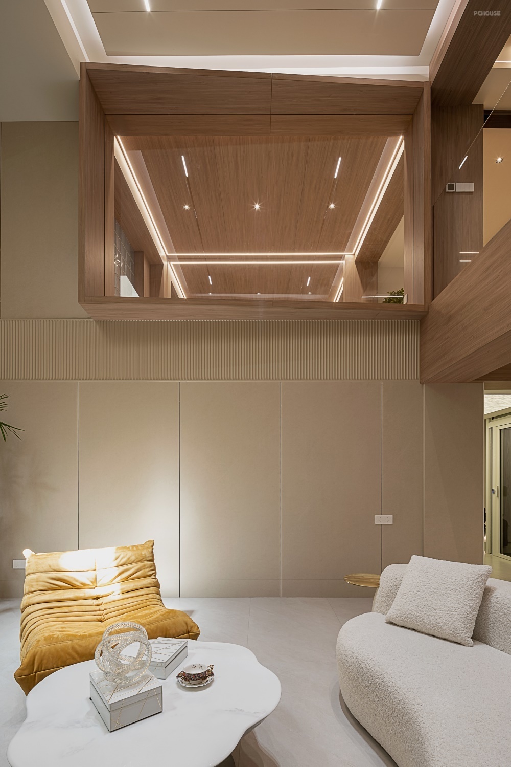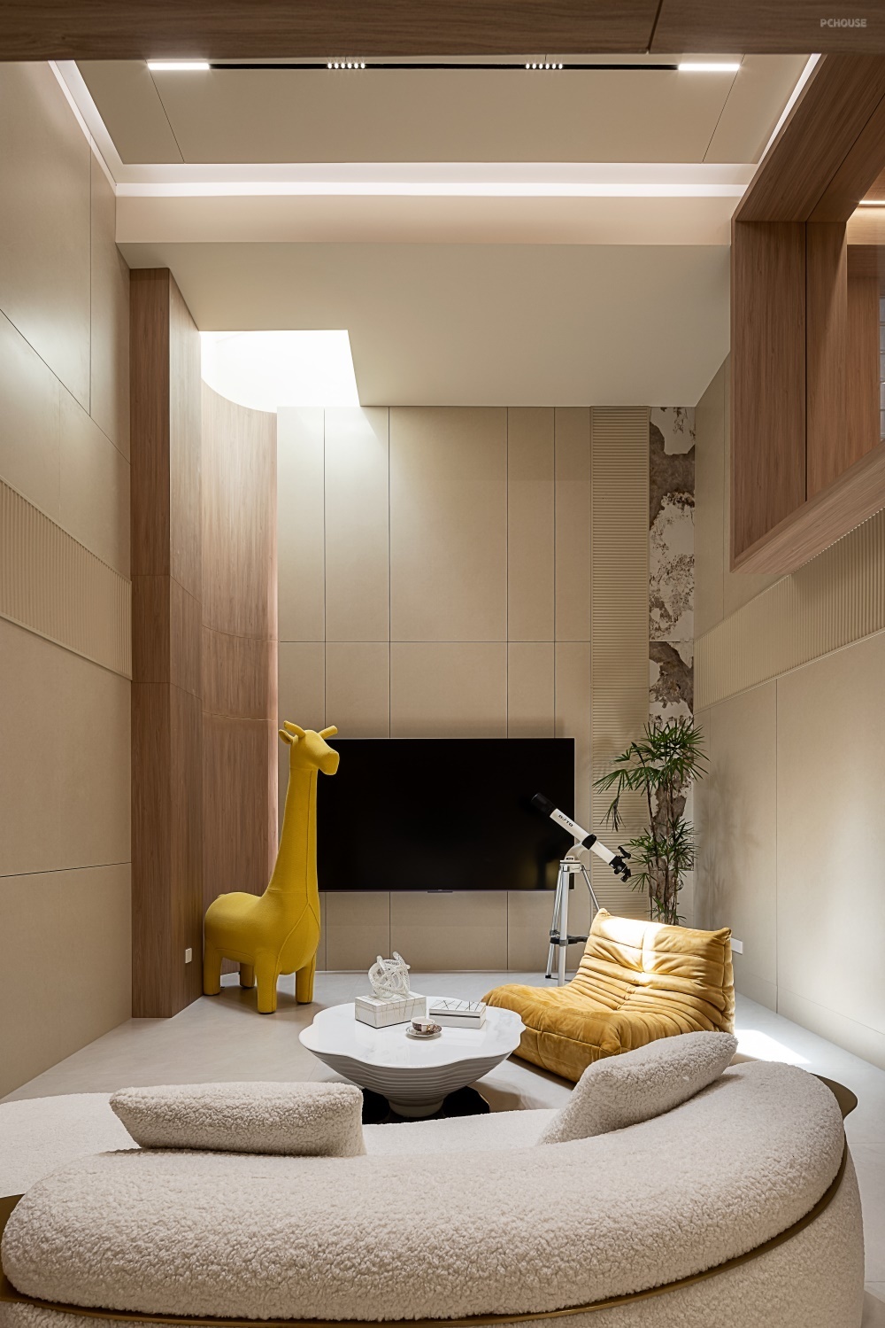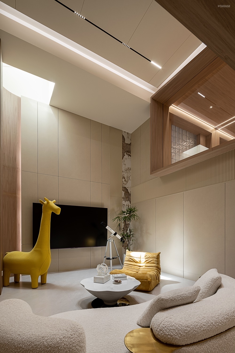 地下室的影视厅设计在挑空处,通过天窗,将自然光引入室内。天窗下方,转角利用弧形木饰面柔化空间棱角,增添艺术感。电视背景墙以格栅板与大理石拼接而成,5 米挑高设计让其气势磅礴,仿佛一幅立体的艺术长卷。顶部悬浮灯带与暗藏磁吸灯,营造出沉浸观影氛围。
