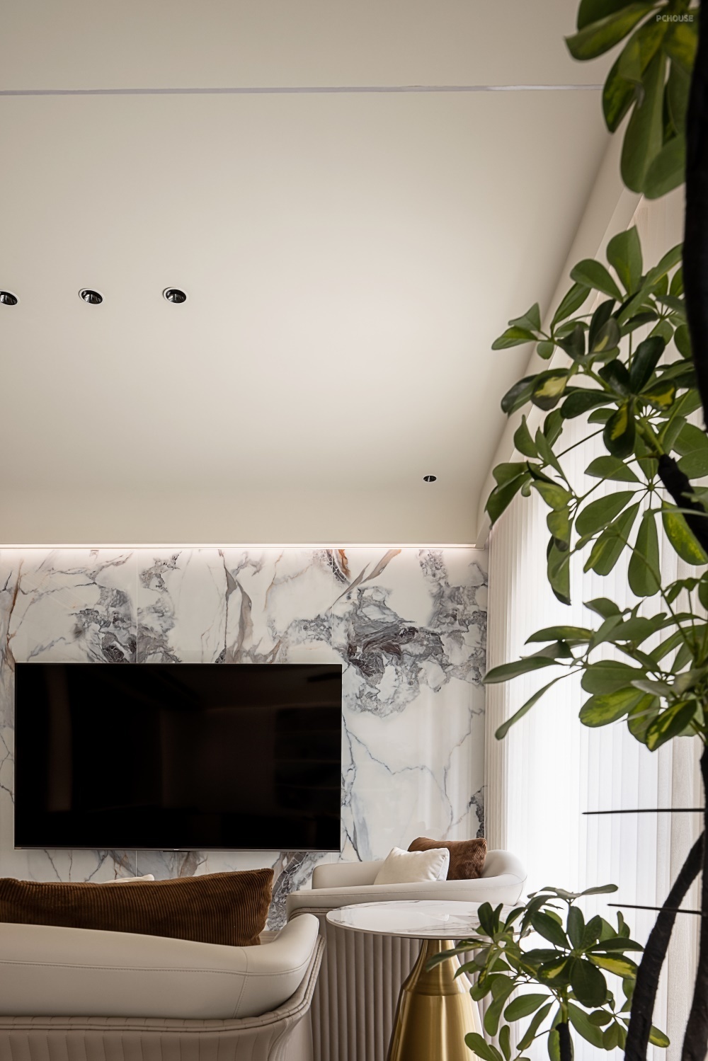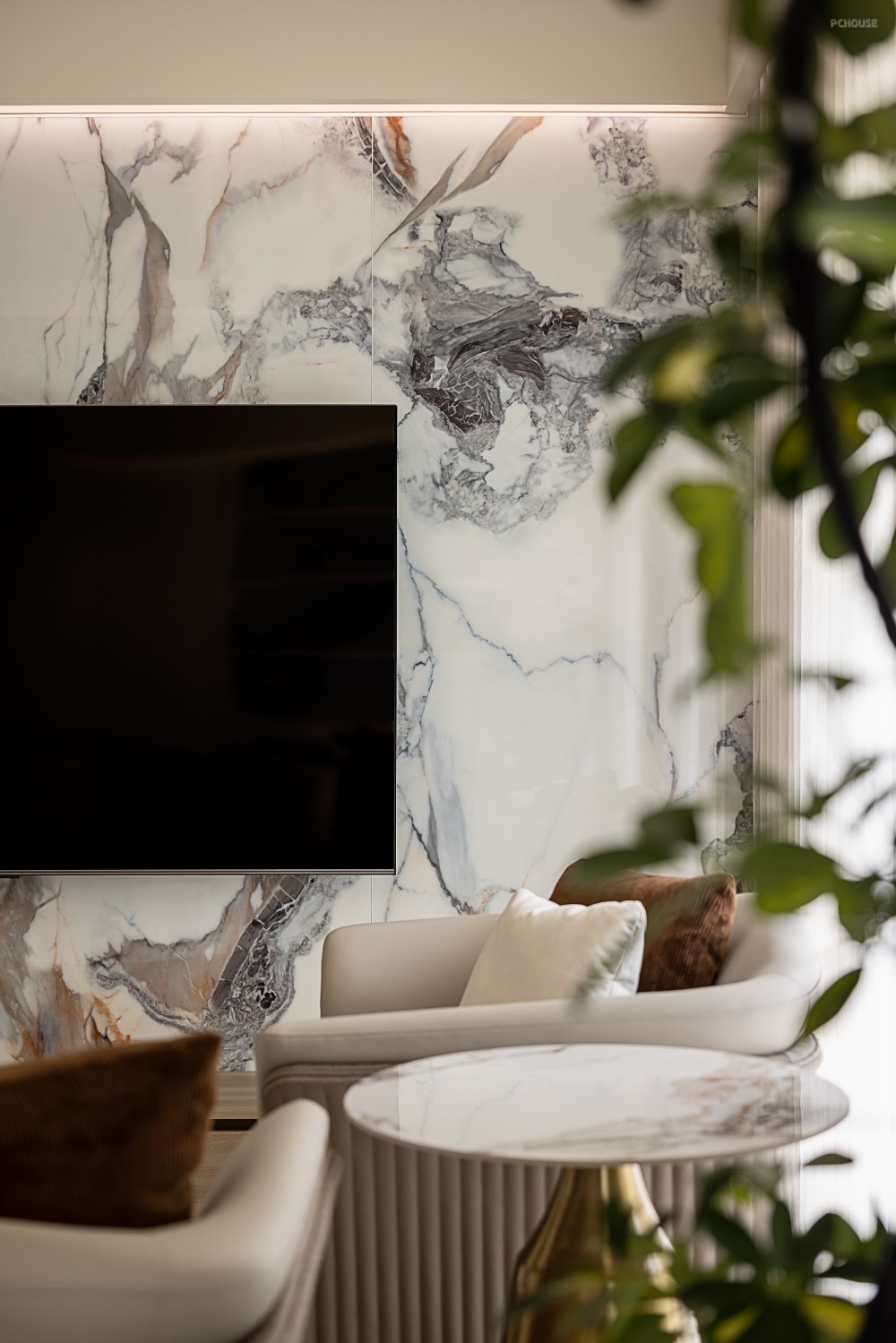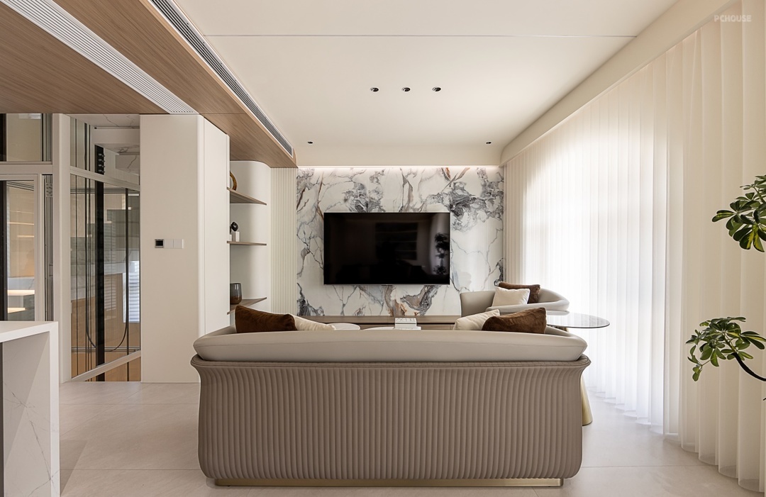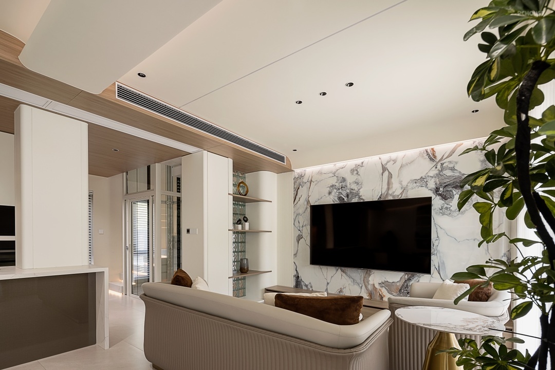 客厅电视背景墙采用大面积的岩板为基底,顶部弧形转角,内嵌的 LED 线性灯带隐藏于弧面凹槽内,暖光自顶部向墙面晕染,形成「光瀑」般的渐变层次,夜晚点亮时宛如悬浮的星河边界。