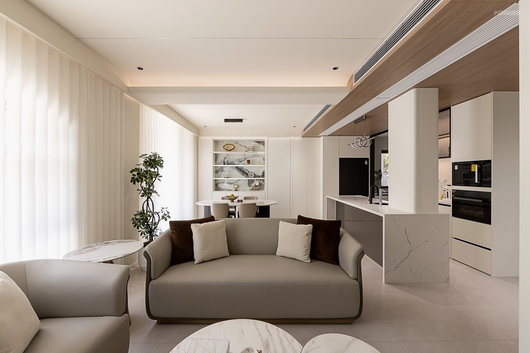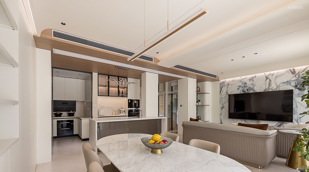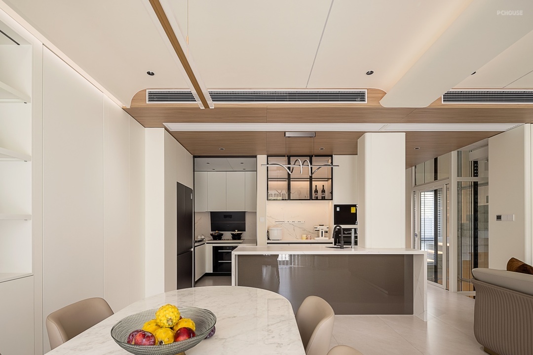 岛台上方木饰面吊顶搭配筒灯,暖光倾洒,为烹饪与欢聚增添温馨氛围。通往厨房采用移门可灵活开合,L 型厨房布局高效实用