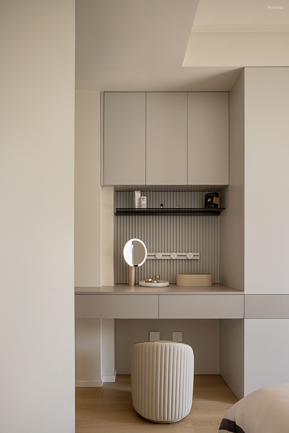 化妆区上方柜体深度内退20公分,贴心的人体工学设计,避免起身时的意外碰撞,给予使用者周全呵护。中间背景墙采用木格栅,搭配通透的亚克力板层架,轻盈质感中彰显现代美学。层架之上,常用化妆品有序陈列,触手可及,让每一次妆扮都成为优雅的仪式。晨起梳妆、夜间更衣的日常场景,在此形成流畅的生活动线,让私密时光更显从容雅致。