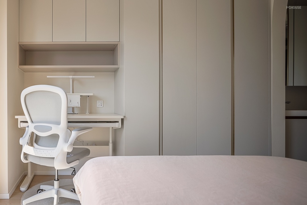 床尾区域也采用 “衣柜 + 书柜” 一体化定制柜体,顶天立地设计最大化利用垂直空间,书桌也是选择可调节高度的成品书桌,桌面倾角与升降功能可随孩子成长灵活调整,满足不同年龄段的学习需求。