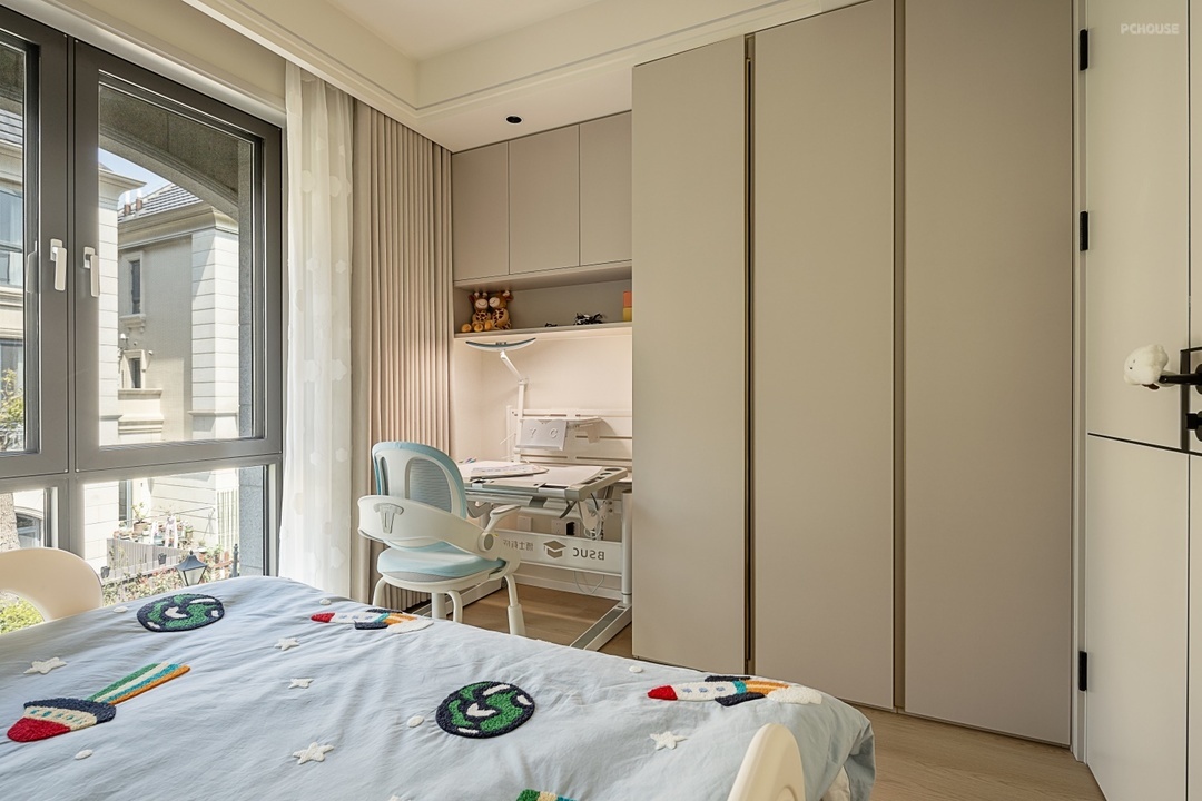 床尾一侧靠墙定制柜体将衣柜与书柜一体化设计。书柜体上方为封闭式书柜,满足书籍与藏品的收纳需求;中部开放层架,可陈列装饰摆件或常用物品,兼具美观与实用性;底部连接成品升降书桌,可根据孩子的成长阶段自由调节高度,兼顾学习的舒适性与成长性。