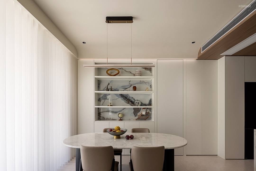 餐厅选择弧形餐桌,流畅的线条美观同时防止磕碰,从容承载 6 人围坐的温馨场景。靠墙而立定制餐边柜,通过精巧的柜体分层设计,在规整收纳的同时延伸出展示功能。层板背后的背景墙铺陈质感细腻的岩板,其独特的纹理与光泽,为空间注入高级格调。柜体一侧结合隐形门与温润木饰面自然衔接,在开合之间巧妙化解墙面的单调,彰显设计巧思。