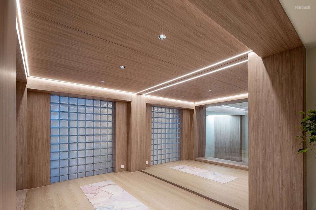 拾级而上,影视厅上层巧妙规划为健身区与茶室。健身区采用玻璃砖隔断,半透明的材质既保证私密性,又将车库的光线悄然引入,让运动时光充满灵动光影。温润的木质构筑起自然舒适的运动氛围。