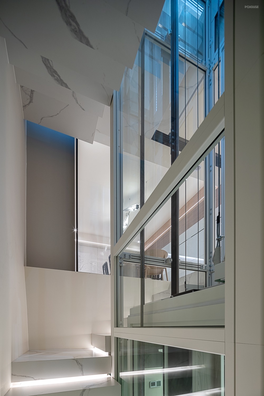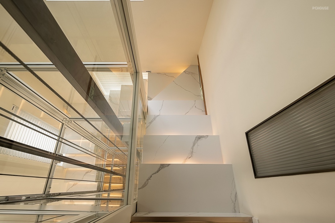 在楼梯与电梯空间设计中,楼梯区域选用大理石台阶,并在其内部暗藏感应灯带,当有人经过时,灯带会自动亮起,不仅增添了空间的美感,还提升了使用的安全性与便利性。