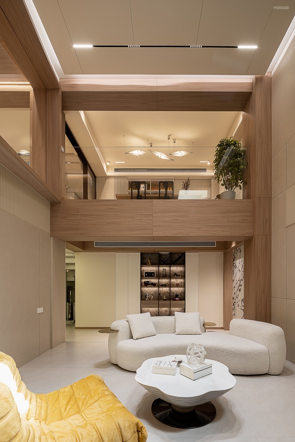 设计美学与材质语言整体以纯净白色为基调,大面积运用原木装饰墙面与顶部,通过自然肌理的质感碰撞,营造出简约温润又不失格调的居住氛围。从公共区域的开放式互动场景,到私密空间的静谧氛围,再到地下层的多元功能聚合,本案以空间重构与材