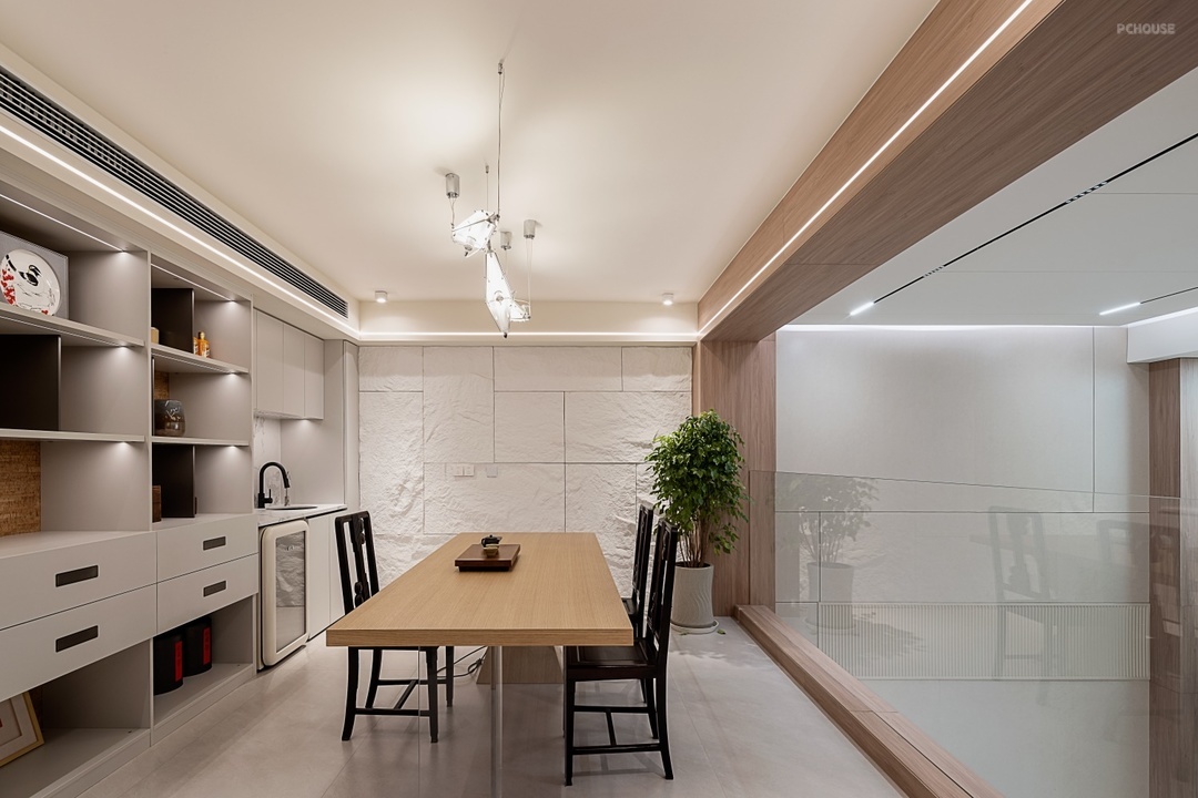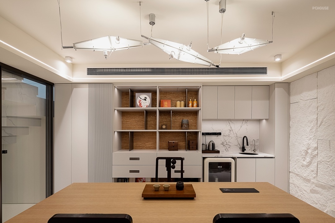 茶室区域以 “实用与美学融合” 为设计核心:主墙定制整面「展示柜 + 吧台」一体化柜体,展示柜开放格和抽屉结合,摆放各类茶叶与茶具,在水吧台下方嵌入小冰箱方便存放冷饮,吧台台面可作品茶、备餐区,兼具收纳与社交功能。