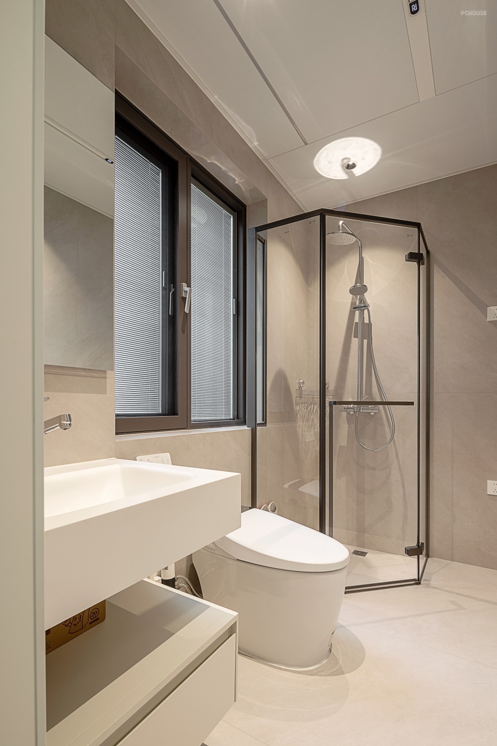 一楼客卫整体采用一字型布局,最大限度利用空间动线。以 “小空间・大功能” 为设计理念,将台盆、马桶、独立淋浴房与洗衣机区四大功能模块,巧妙整合于方正空间内,搭配纯净白色调,打造出清爽整洁的卫浴环境。