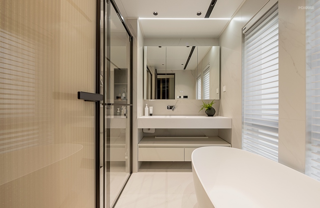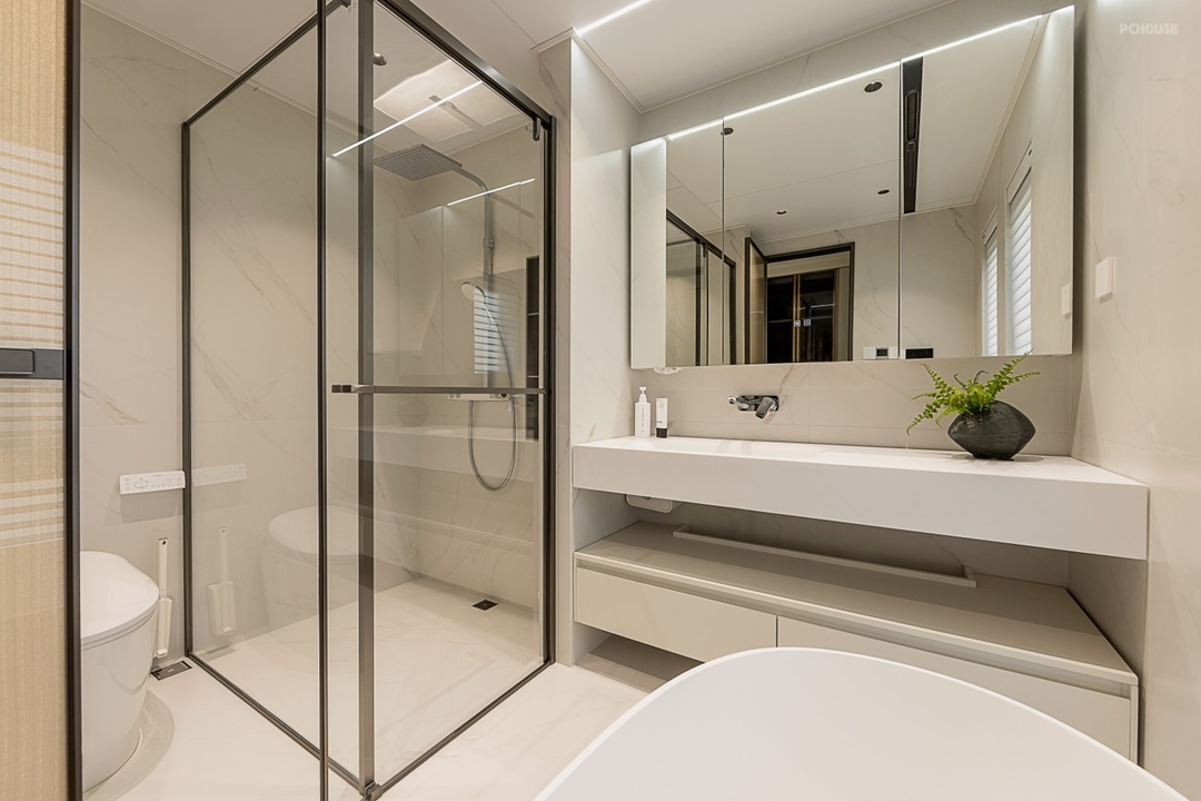 三楼主卧卫生间采用三分离式布局,以玻璃隔断实现淋浴区、马桶区与浴缸/台盆区的独立划分。台盆上方安装长型镜柜,镜面内置防雾膜,柜体内部隔板分类收纳护肤品。