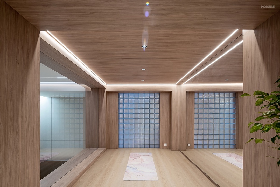 一侧通透的大玻璃打破封闭感,另一侧巨幅镜面垂直而立,通过反射原理拓展视觉空间,同时便于运动者观察动作姿态。顶部暗藏隐形灯带勾勒出空间的层次轮廓,而嵌入式筒灯则似繁星点缀,为健身区增添温馨而富有韵律的照明氛围。