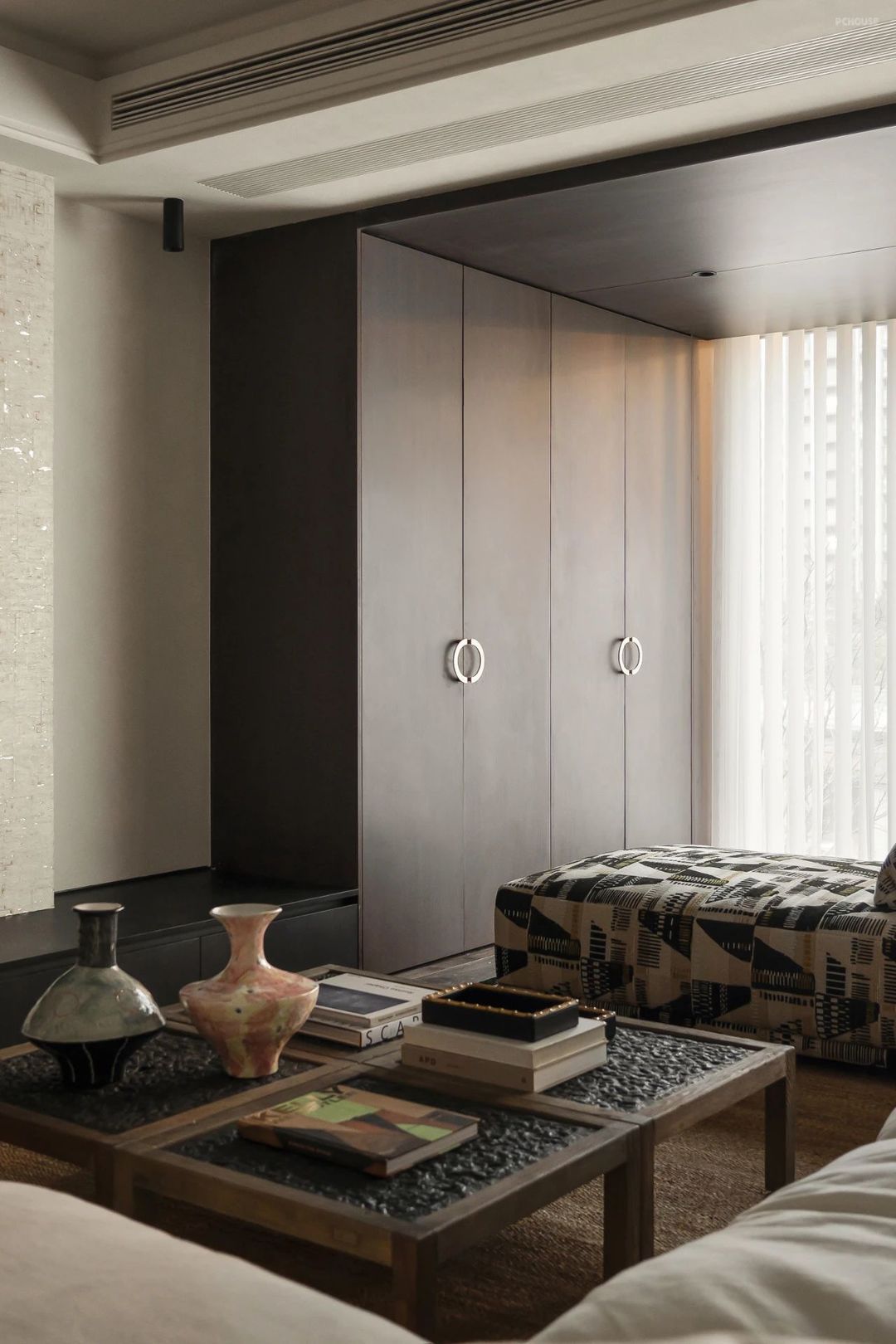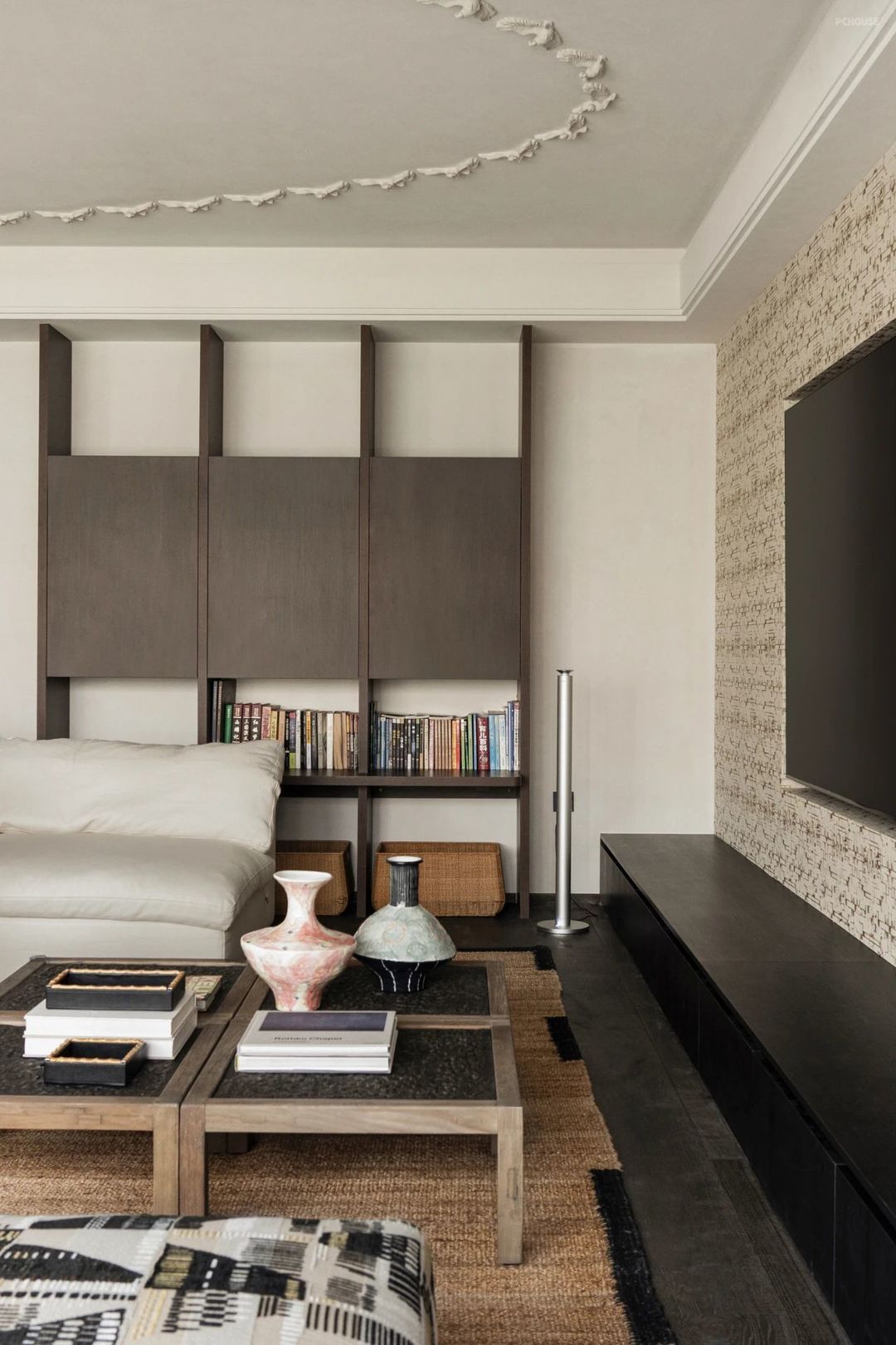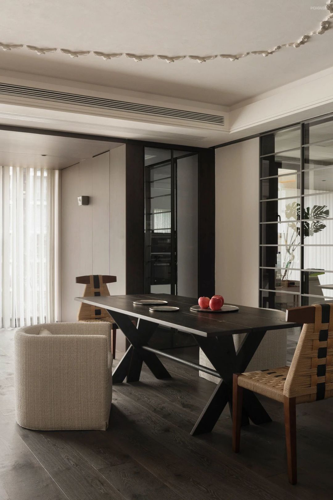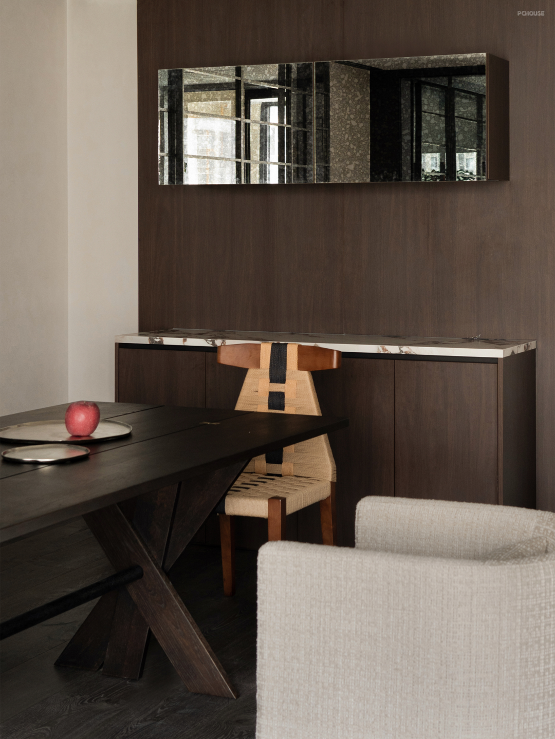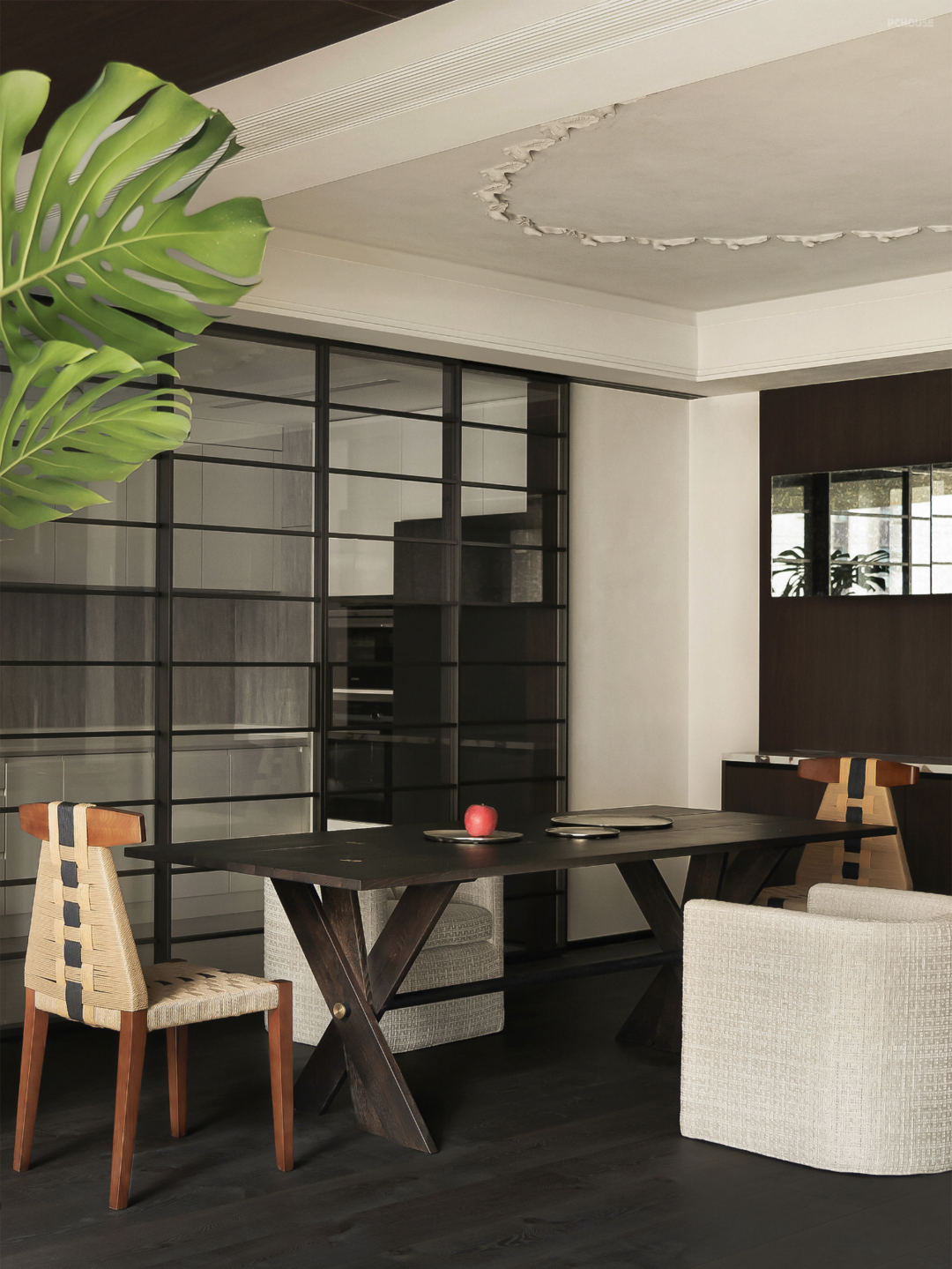 我认为设计一个折衷主义格调的空间其关键点在于,要让古典与现代的器物、材质、空间装饰造型在线型上协调统一,空间所有的颜色做到彩度基本统一,这样空间的效果就会得到保障。