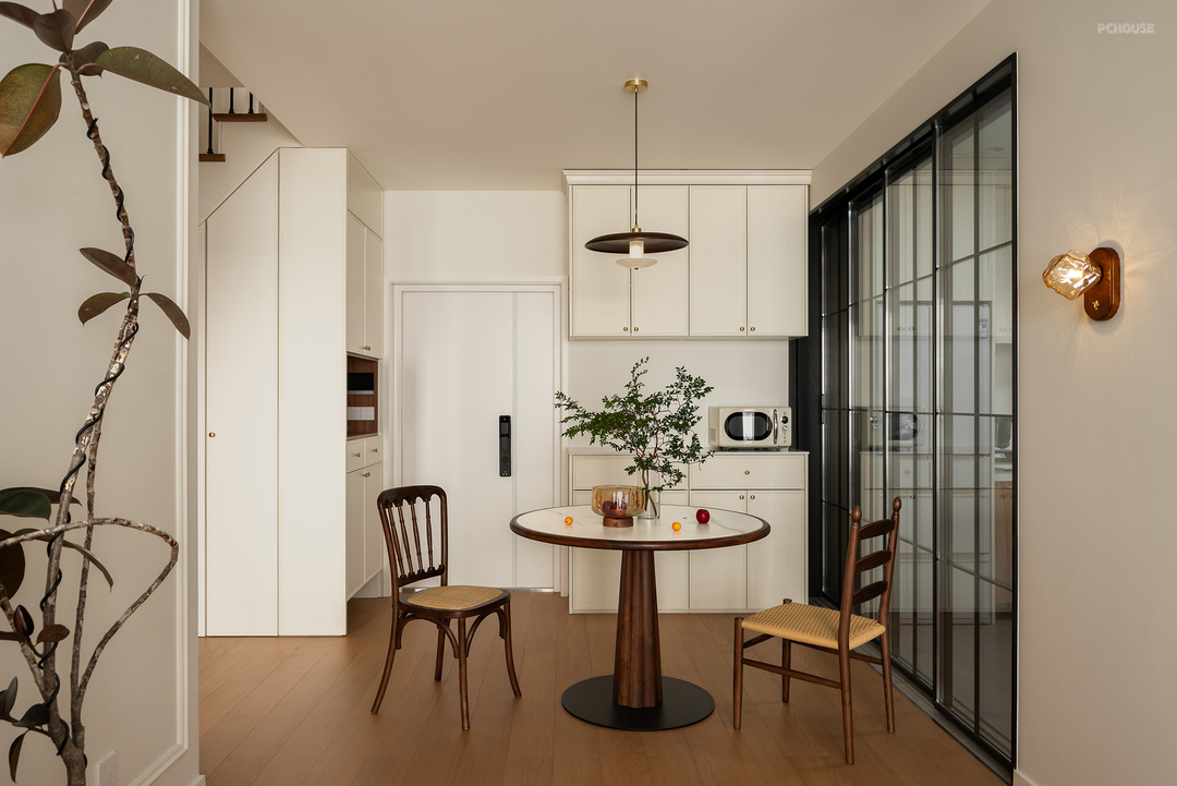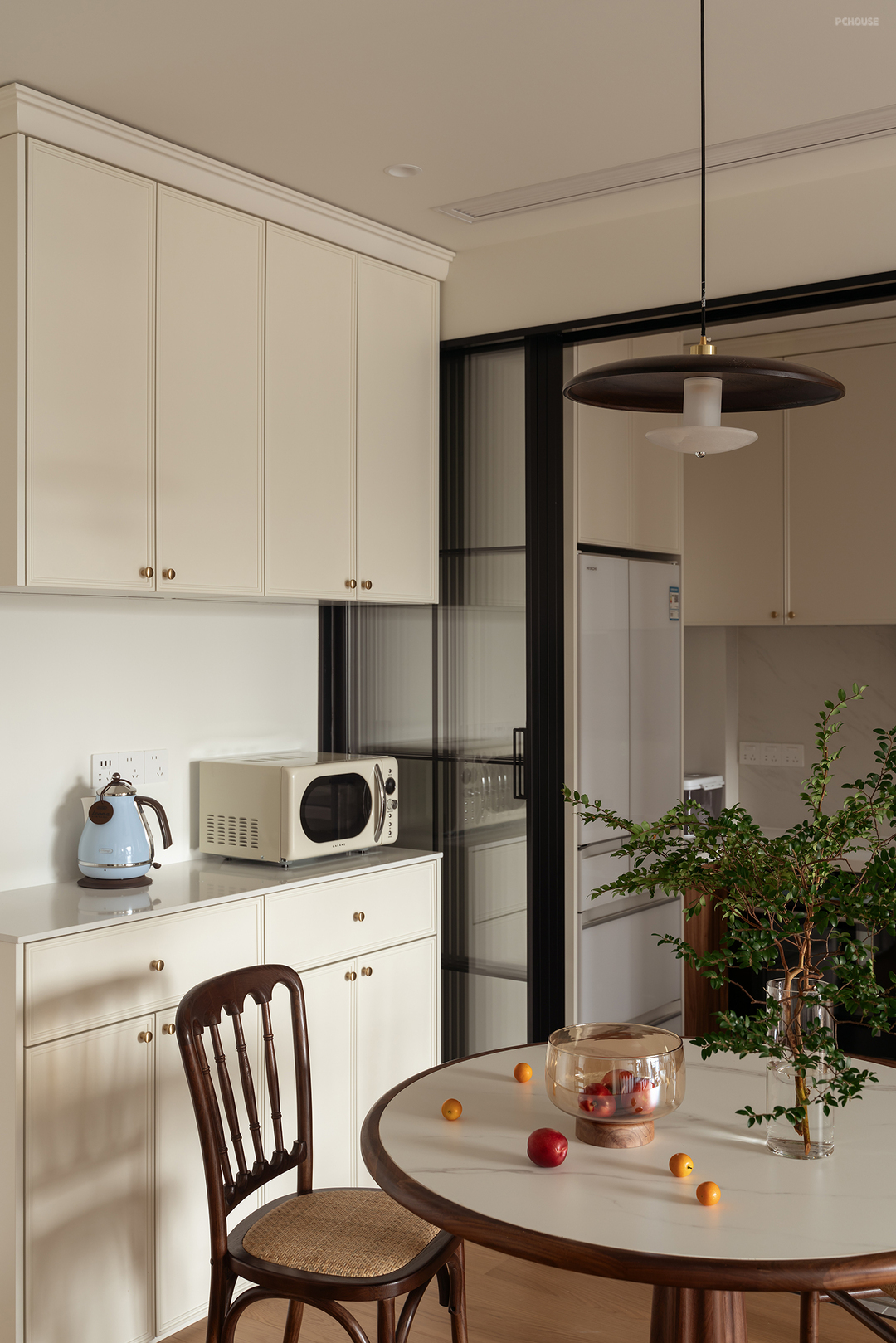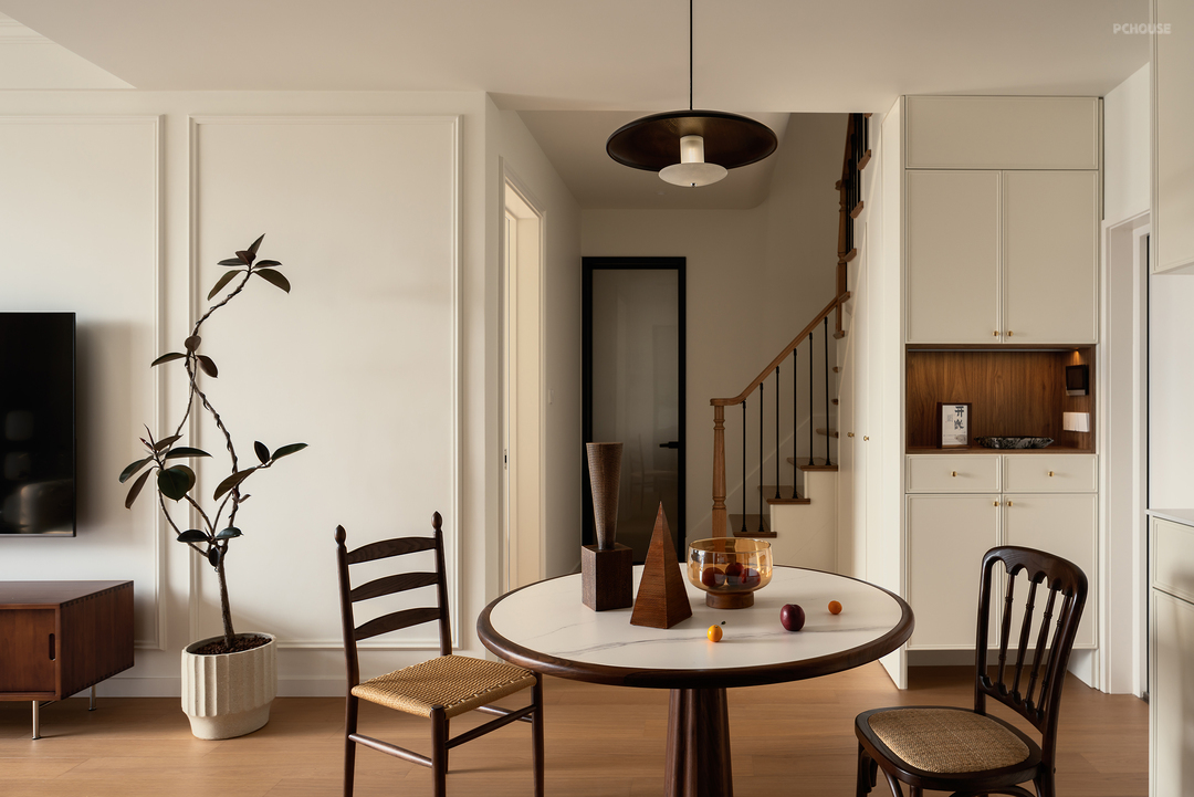 餐厅采用圆桌布局,给归家时刻营造出一种仪式感,同时一家人一起团圆温馨的氛围就此渲染开来。顶部吊圆形灯营造迷人光影效果,与餐桌相互辉映。靠墙的餐边柜,提供了更多便捷的收纳空间。