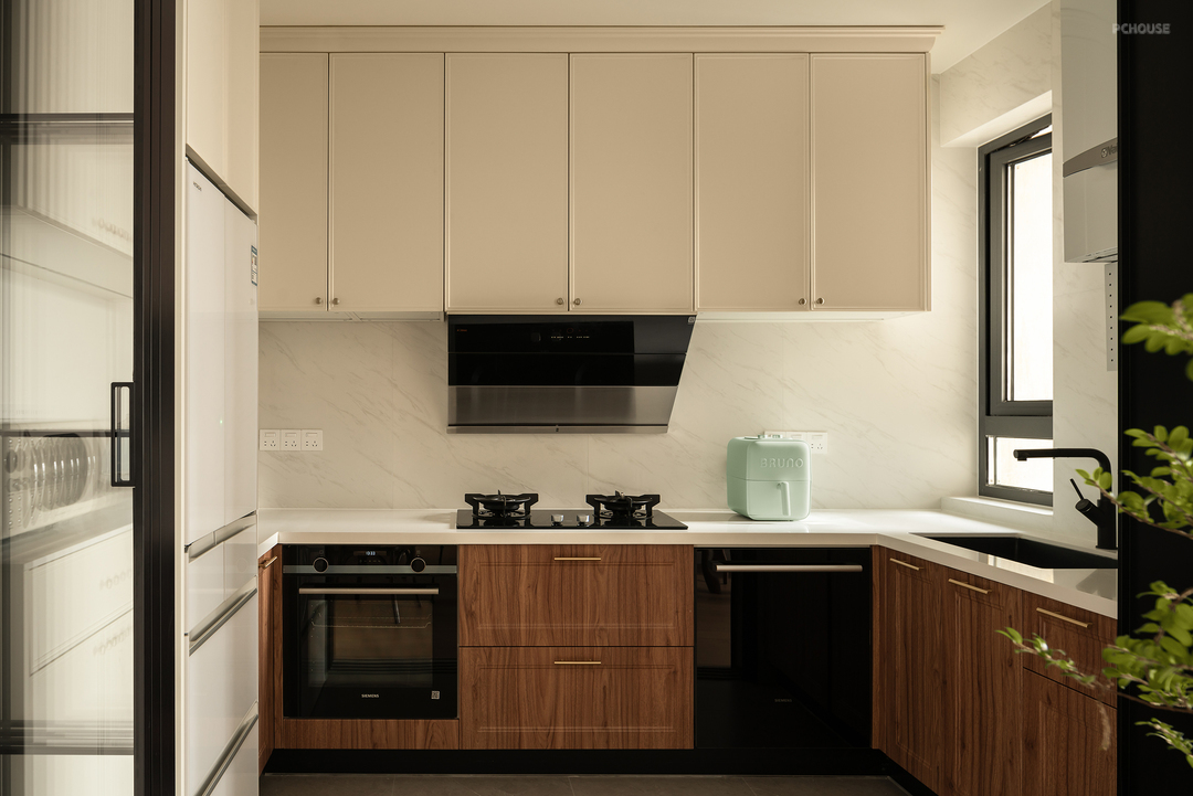 厨房采用了可开放式四联动移门,封闭与开放结合,空间灵活布局。为了提供更好的稳固性,尤其为老年人考虑,选择了底部隐藏轨道的设计,也起到很好的防滑作用。厨房U型布局,柜体白色和木色分色设计,给厨房增添了复古的韵味。底部内嵌电器柜,洗碗机和烤箱,冰箱位于厨房的一侧。
