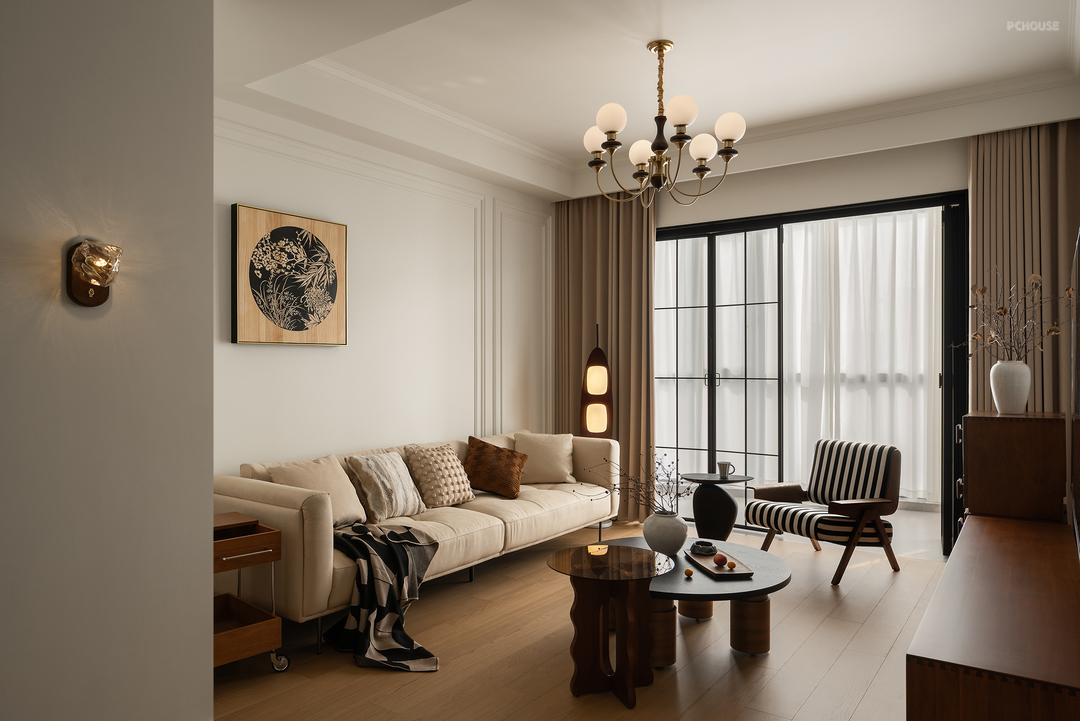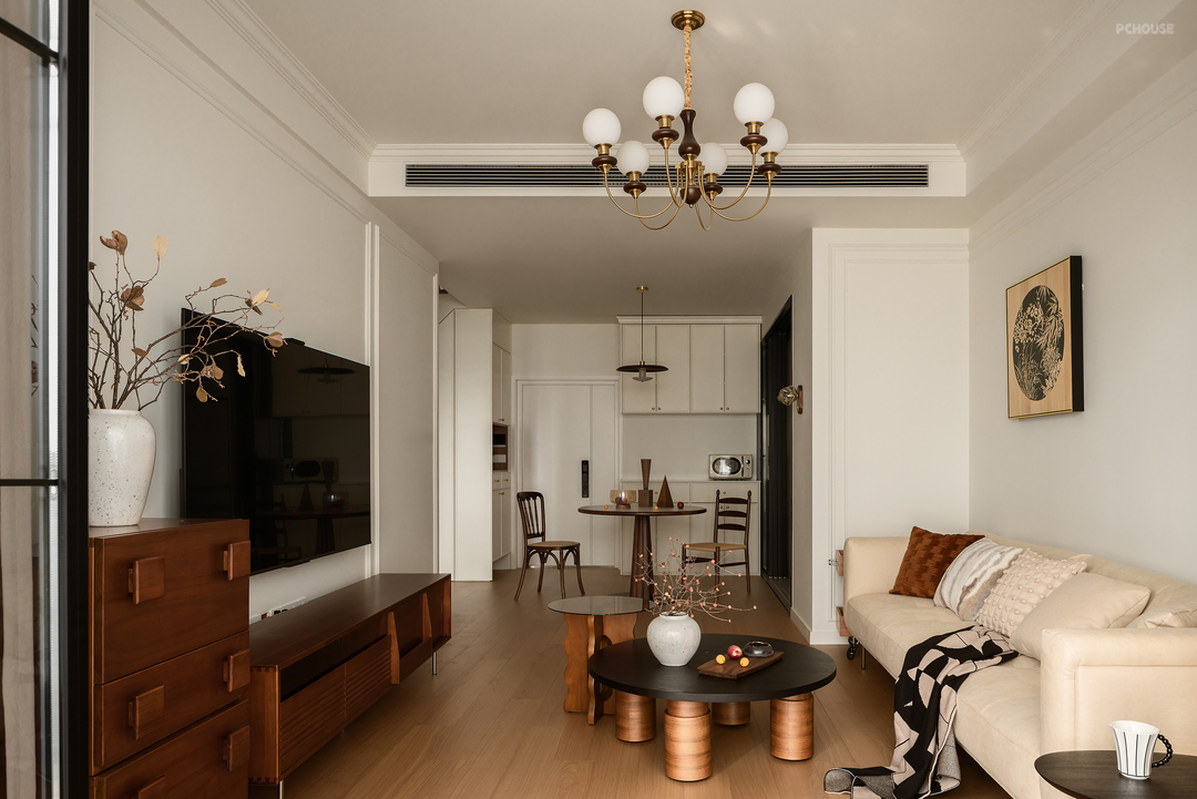 全屋采用淡雅的奶油底色,温馨且充满治愈力,搭配着精致的石膏线装饰,展现出法式的浪漫与优雅。奶油的三人座沙发,精心挑选的茶几、电视柜、装饰柜和挂画都融入了中古的元素,古色古香的韵味碰撞法式的浪漫,带来独特的视觉体验,每1㎡都是治愈!