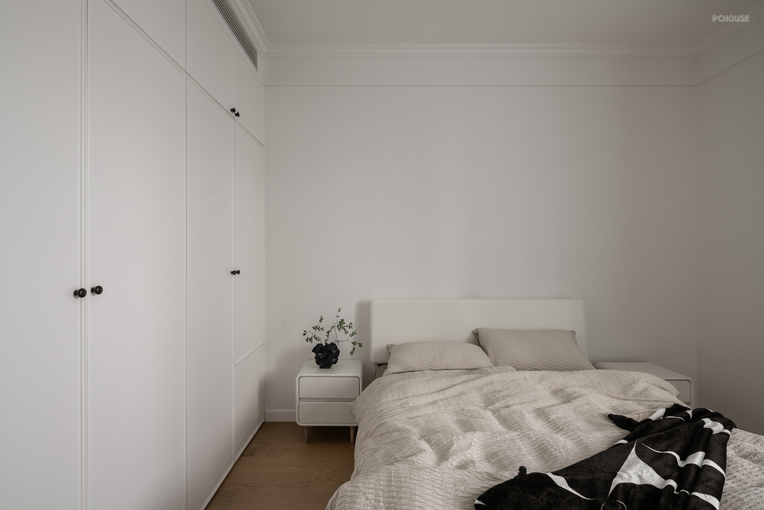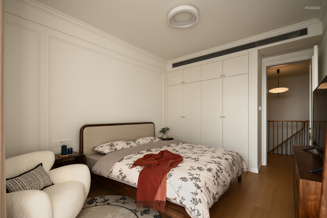 二楼主卧,整体延续奶白的法式浪漫格调,床头背景墙床头PU线条勾勒的曼妙线条,立体美观。床头一侧搭配休闲单人沙发,电视机巧妙摆放在床尾,为夫妻俩共享温馨时光创造了完美舞台。而床的另一侧巧妙融入了订制一排超大衣柜,不仅增加了主卧的储物能力,更巧妙的在衣柜顶端设计了中央空调,为整个空间增添一份舒适与便捷。
