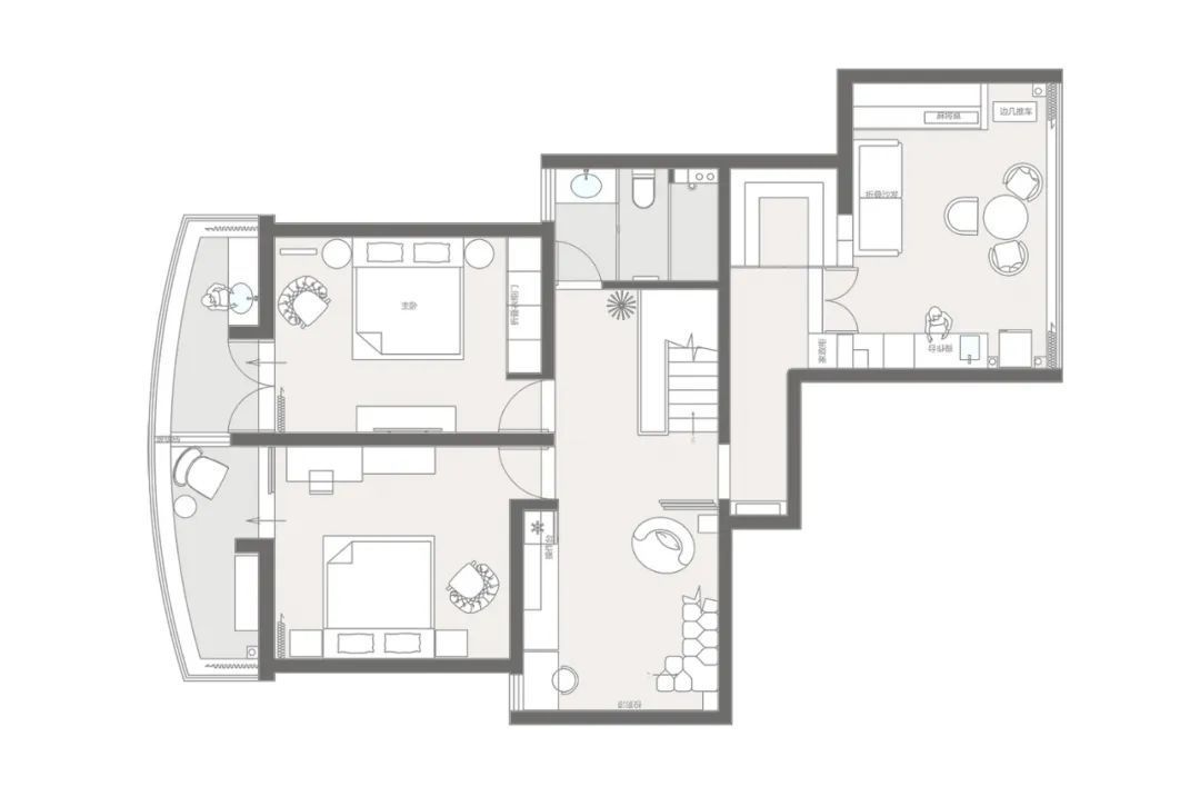 二楼是业主夫妻和儿童房,还有两个多功能房,多功能影音厅+多功能阳光房,满足业主多元化需求。整体采用法式的浪漫优雅,搭配古色古香的中古家具,在柔和的奶油色系下,结合精致的法式金属元素点缀,创造出独特迷人的浪漫氛围,完美展示了法式中古混搭的魅力,颇具时光韵味的浪漫生活场域。