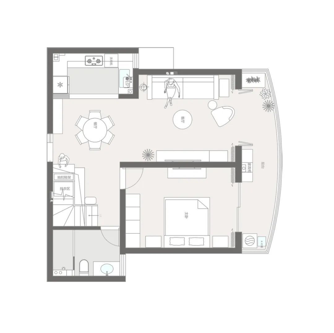 一楼主要是客餐厅厨房公共区+父母房,还有采光超好的落地大阳台。将父母房和阳台结合,扩大父母的活动空间,同时卫生间的设计更是基于人性化角度开,为老服务贴心周到。