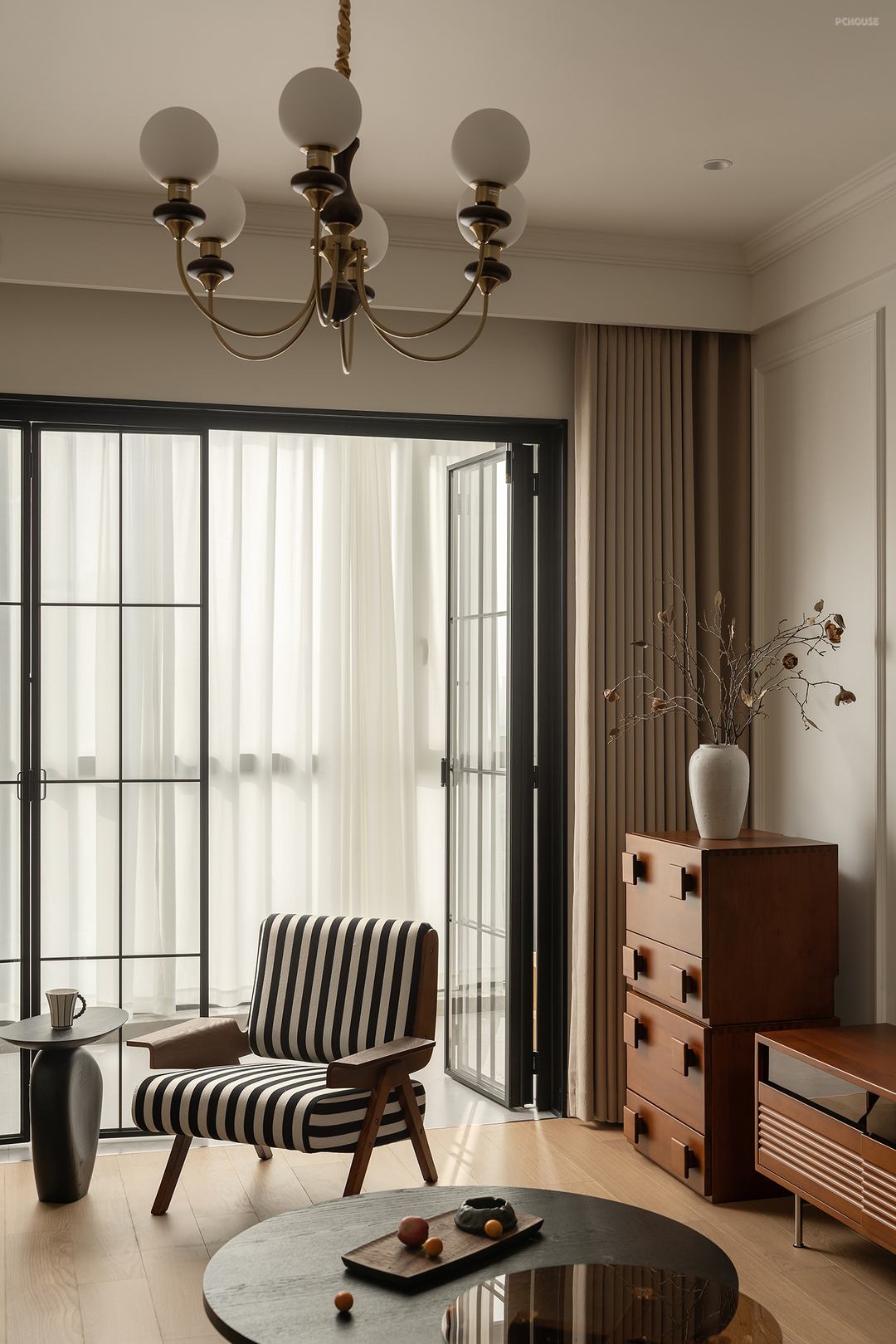 客厅背景墙采用了石膏线条来打造法式独特的造型,结合金属元素以及中古家具,增添了独特的品味。为了充分利用阳台的采光优势,我们选择了折叠门来分隔阳台和客厅。特别是夏季阳光强烈时,开启空调如果不做隔断,电费肯定飙升。因此,我们的折叠门不仅美观而且节能。