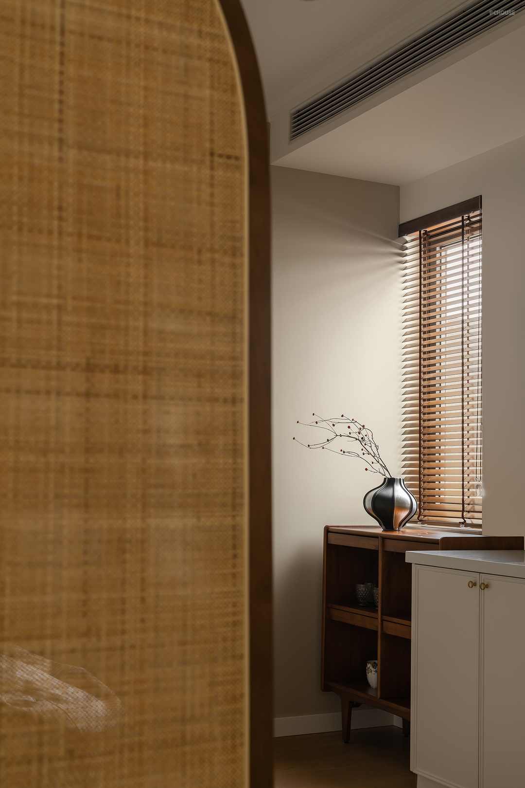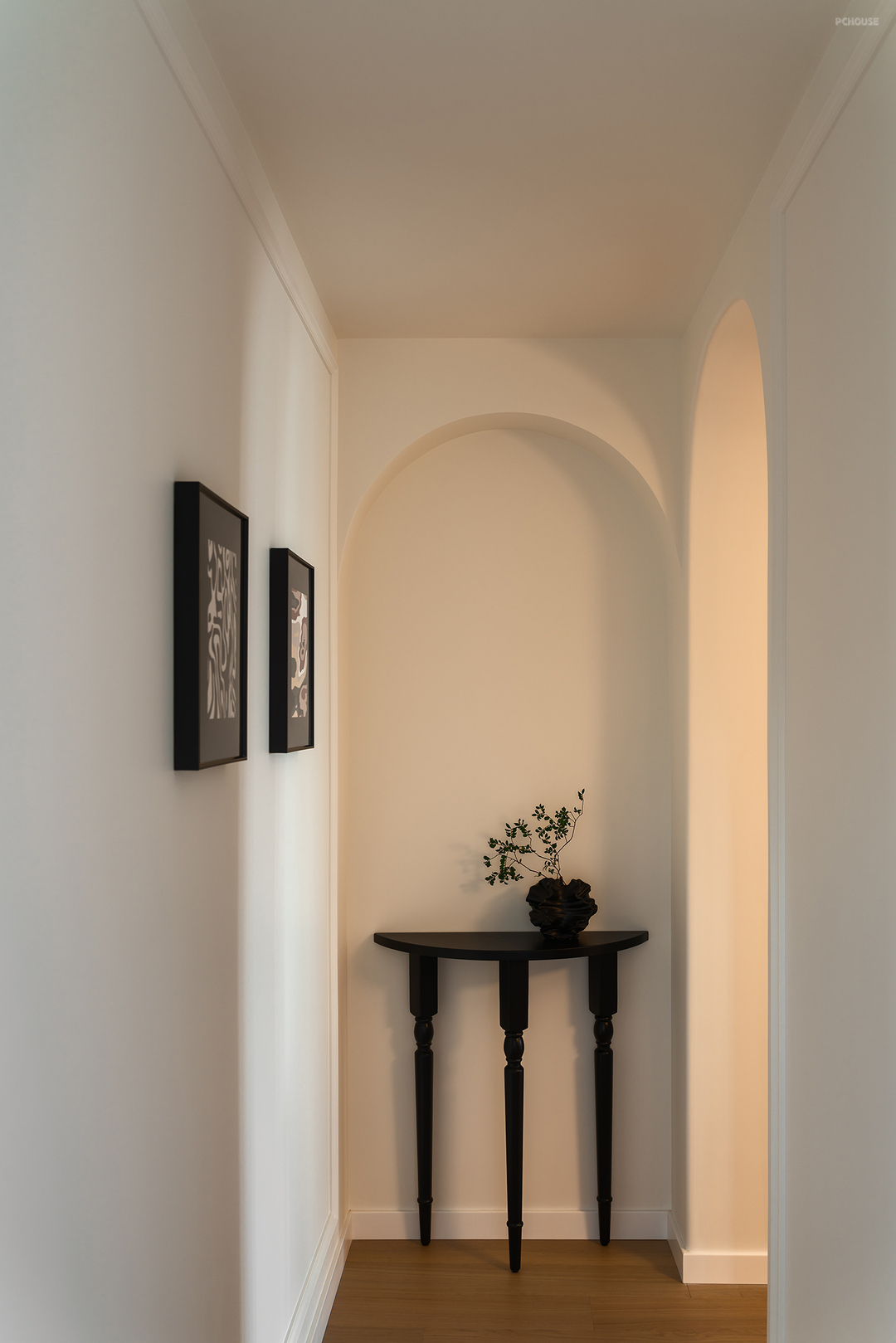 进入阳光房的过道,你会看到过道一端也设计拱形的造型。它与端景装饰柜巧妙融合在一起,上面摆放着鲜花和绿植,让整个气氛更加优雅。而过道的墙面,则有精美的装饰画,打造着文艺氛围。
