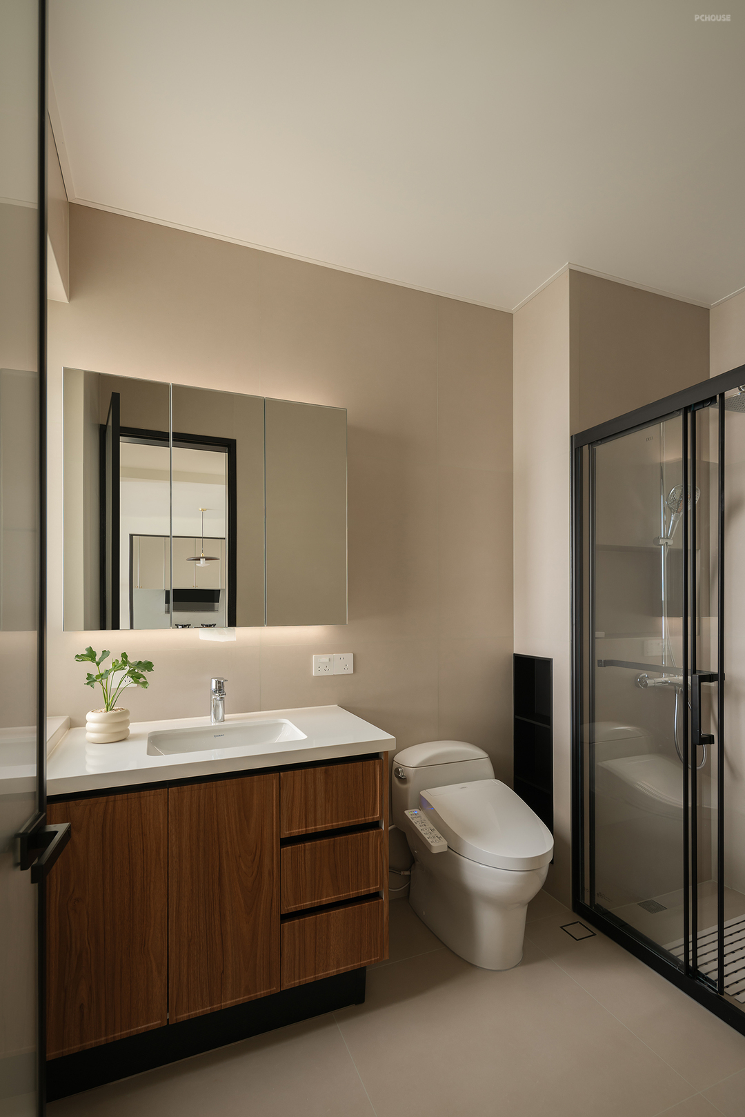 一楼的卫生间,我们在设计的时候考虑到服务老年人的需求。因为随着父母年龄的增长,他们可能会需要使用轮椅,所以我们特别将淋浴房门设计得宽敞一些,以方便他们进出。另外,在淋浴区我们还加入了扶手、坐凳和防滑拖鞋,以提供方便和安全保障给老人。也体现了业主对老人的贴心照顾。镜子选择镜柜,里面可以收纳平时的洗漱用品,保持外面的干净空间。上下暗藏灯带,打造层次营造氛围感。