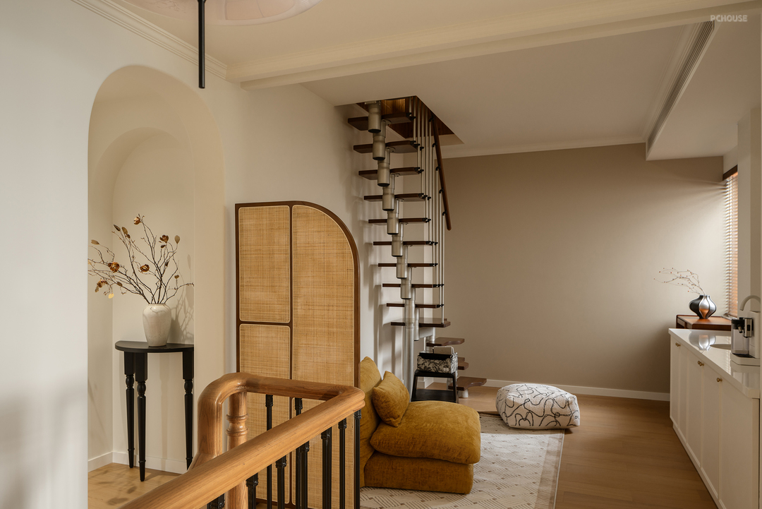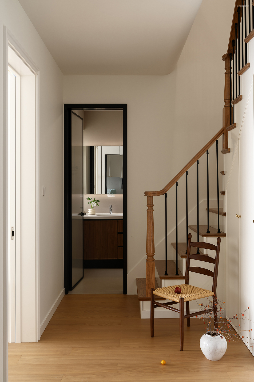 木质扶手结合黑色铁艺护栏,以其独特优雅的线条和坚固的结构,为家居承上启下起到高级的美感,并提供安全性和舒适性。
