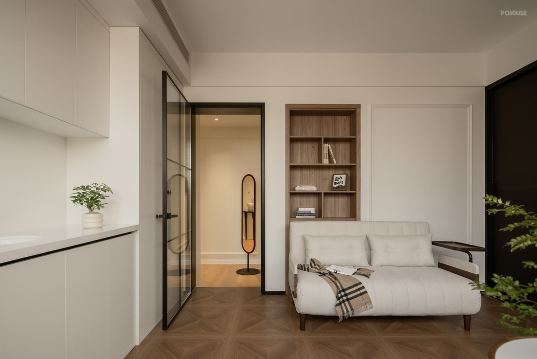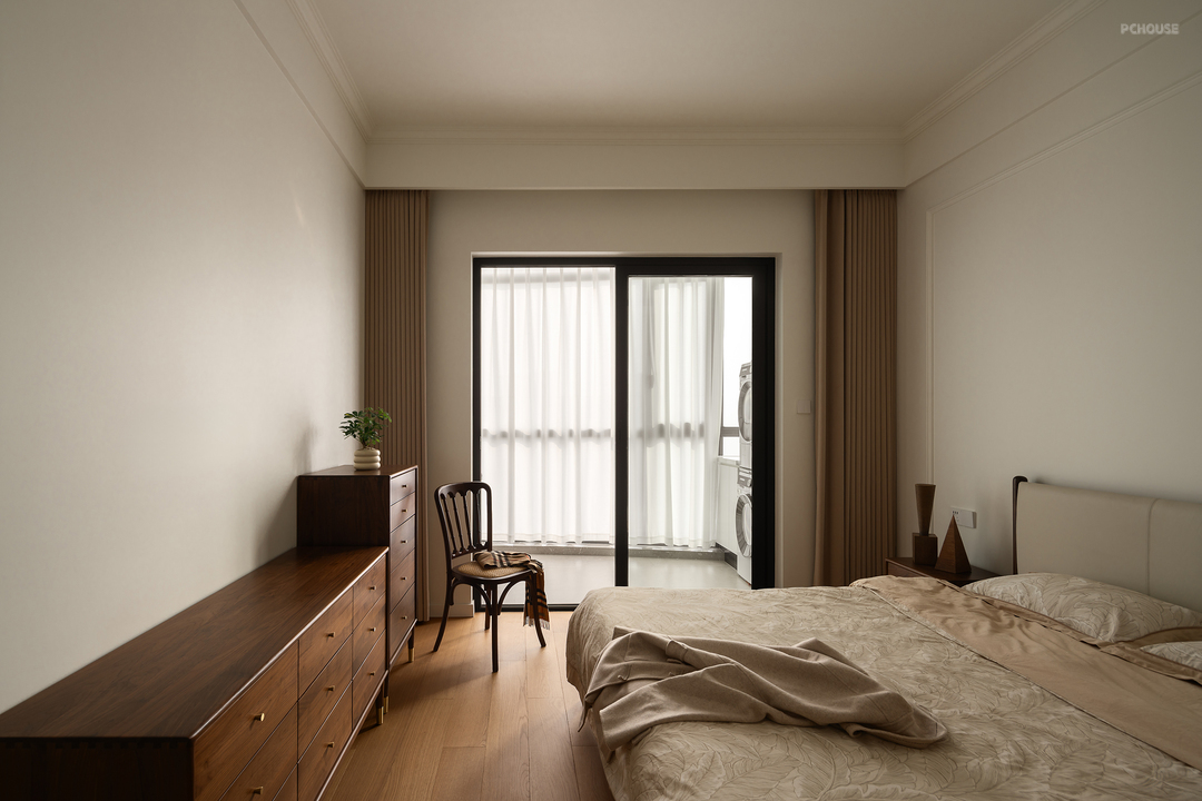 利用1楼的卧室给父母使用,考虑到年纪大了上下楼不便。把原来阳台和父母房打通,使整个空间更显宽阔。通过增加移门隔断,方便老人清洗衣物和晾晒,提升了居住舒适度。地面选用木地板,与整体浪漫柔和色调相呼应,营造出温馨舒适的氛围。