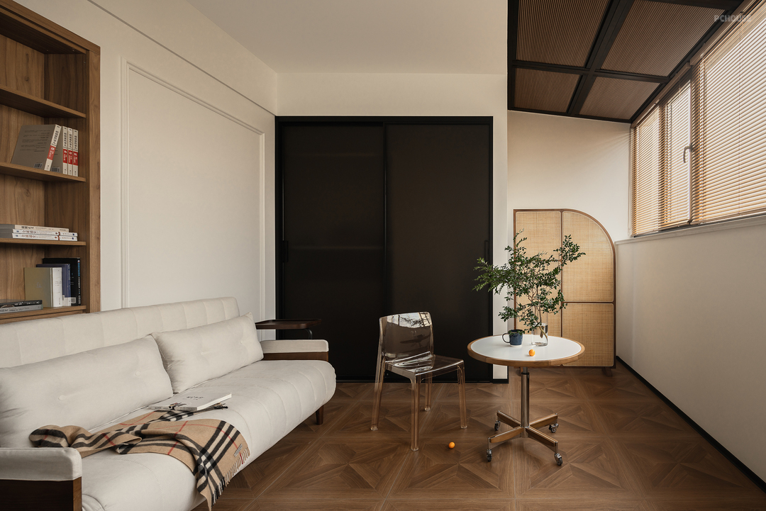 沙发左侧隐藏的小储藏间里面放置了麻将桌,业主偶尔与家人或者朋友在这里聚集娱乐打麻将。地面选择了仿木砖,既美观又防水。书架顶部预留了中央空调,提供舒适的环境。这个阳光房不仅实用还非常舒适,业主很喜欢在这里放松。