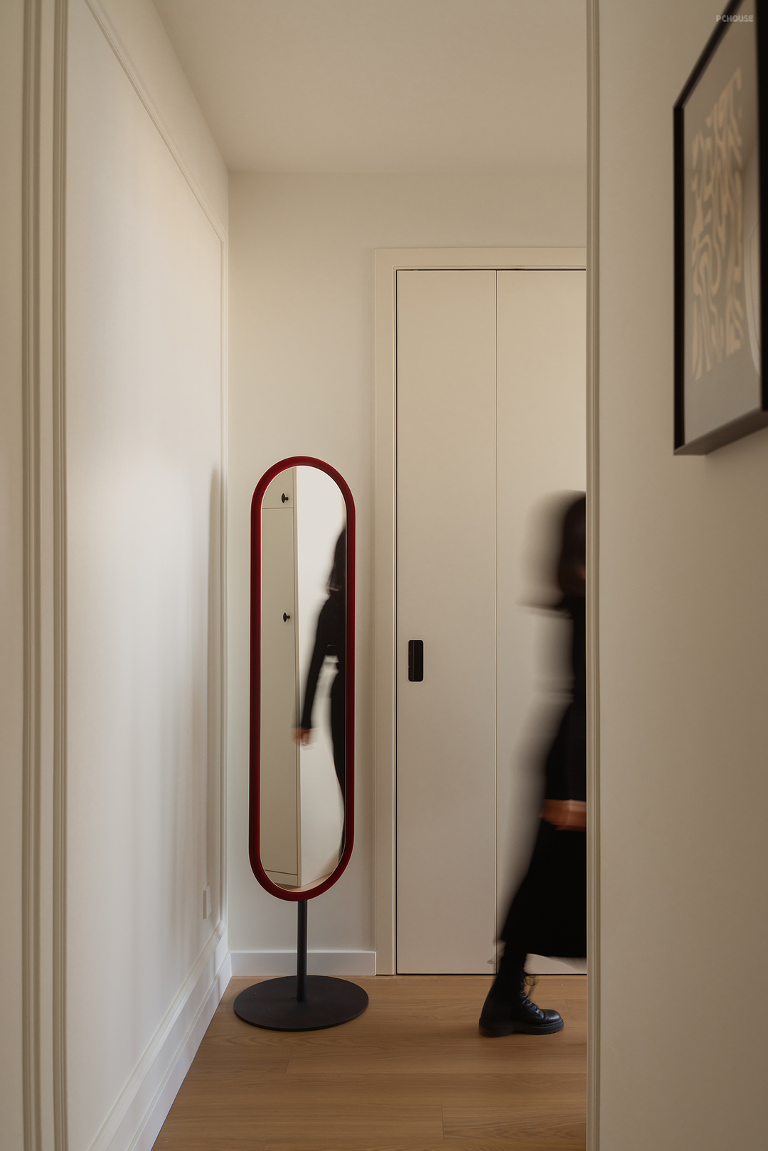 延伸过道另一尽头做了衣帽间空间,柜门我们采用比较高级的隐形的平移的折叠门,抽出来可以外置,放到门的一侧,也比较节省空间。衣帽间外面放置了一面极具艺术品位的全身镜,不仅方便整理造型,还能增加空间感!