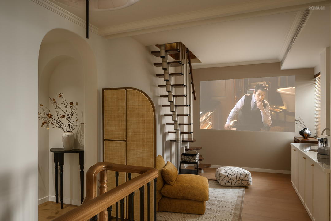 欢迎莅临2楼的影音多功能厅(影音+休闲+临时客房),平时主要为业主和小孩提供私人娱乐空间,利用一正面墙做投影使用,墙面选择佐敦的涂料,哑光面的选择不仅使得投影画面更加清晰,还提供最佳的视觉享受。