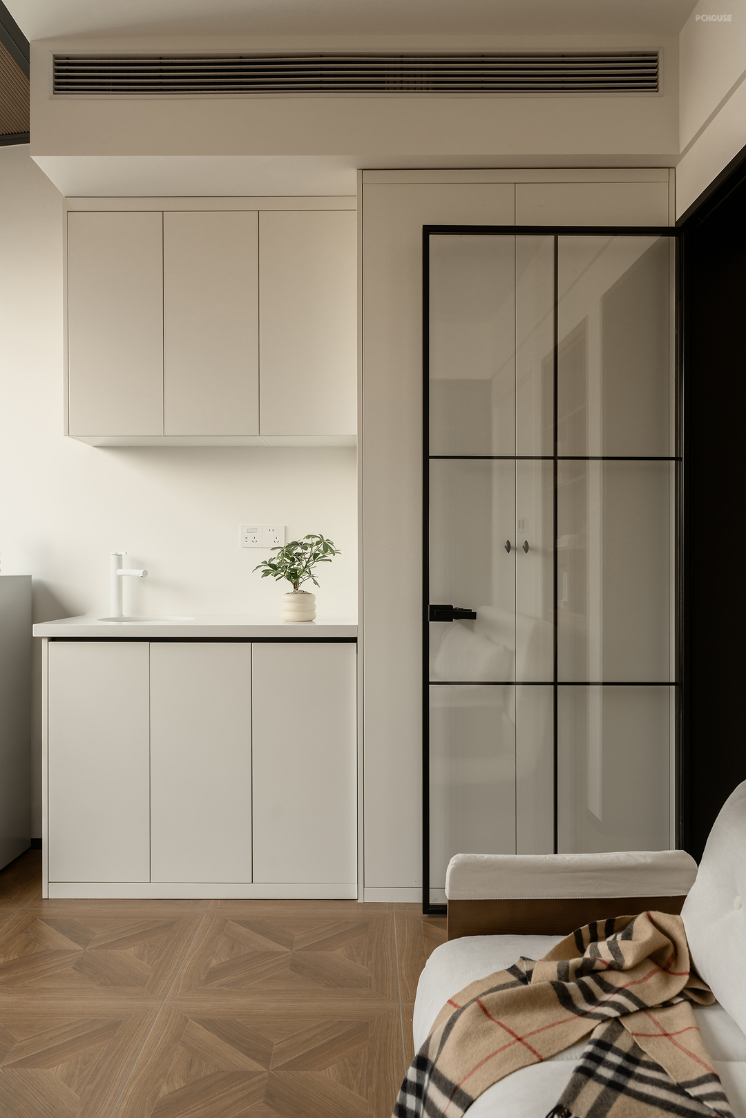 进门靠墙是一排家政柜,结合操作台,上面还设有小水池,方便平时喝茶清洁。